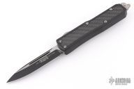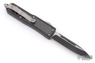 This Daytona OTF automatic features a D/E black finished blade with standard edges, and carbon fiber inlays in the black aluminum handle. Tip down bead blasted stainless clip. Serial number 01013 and dated 05/2011. Has some light scuffs and scratches, great condition otherwise.