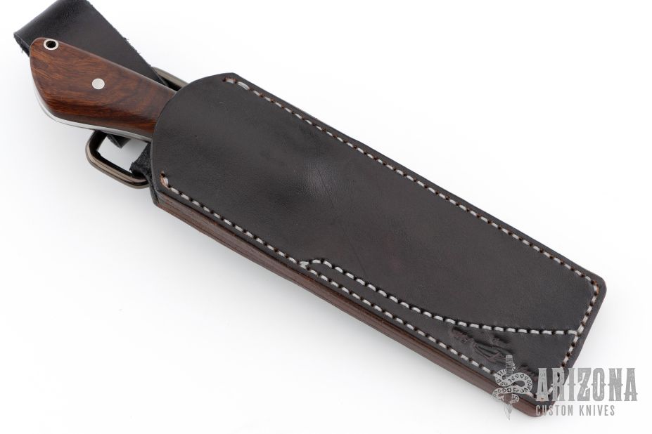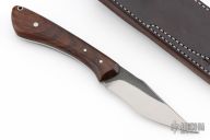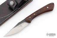 This Model 36 by Craig Falls features a hand rub satin finished blade with raw flats, .111" blade stock and 1" blade depth, full tang construction. The handle has desert ironwood burl scales with black liners, stainless steel pins and lanyard hole. Comes with a black leather sheath with belt loop. Comes with a COA dated 10-20. Excellent conidtion.
