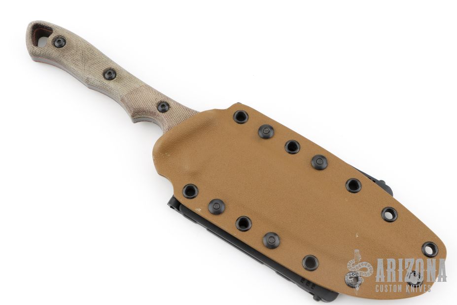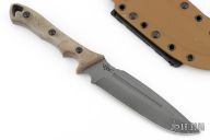 Dark stonewashed blade with milled thumbrest and tang spine, fullers, .179" blade stock and 1.461" blade depth, full tang construction. The handle has brown canvas micarta bolsters, green canvas micarta scales, red liners and a large lanyard hole at the butt. Excellent condition.
