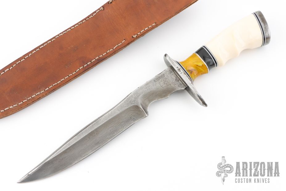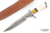 This Guthoot Bowie by Jim Krouse features a Damascus, duplex ground, blade with a file worked spine and notched thumbrest, .233" blade thickness and 1.241" blade depth, hidden tang construction. The handle has a Damascus guard and butt, mammoth ivory grip and amber spacer. Includes a hand tooled brown leather sheath. Has some patina, scuffs, and scratches, great condition otherwise.