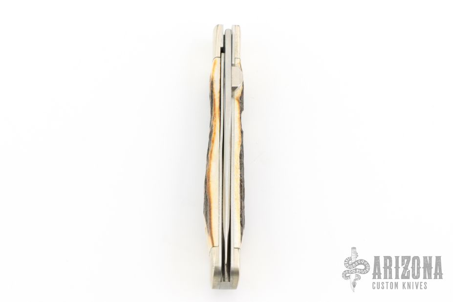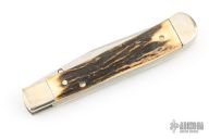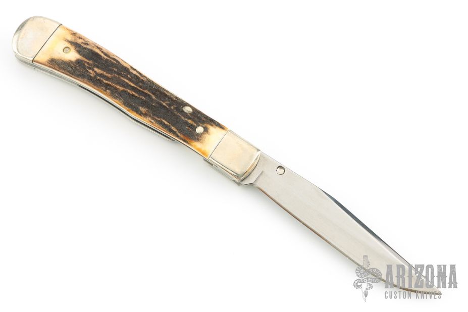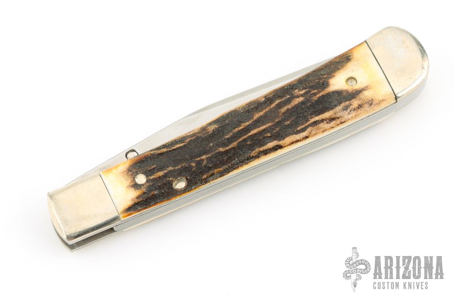 This Boker features a mirror finished clip point blade with nickel silver thumb stud. Has nickel silver bolsters, stag covers, stainless liners and backstrap. Has some light scuffs, great condition otherwise.