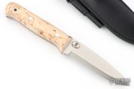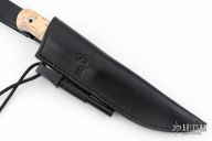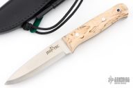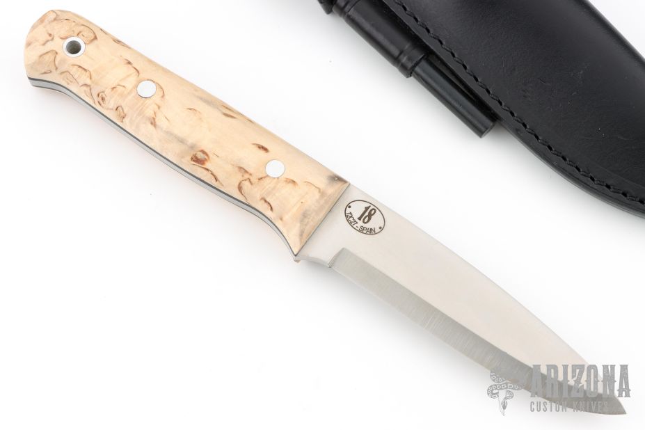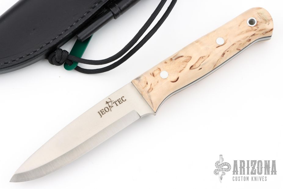 This knife by Jeo Tec features a satin finished blade with .150" blade stock and 1.054" blade depth, full tang construction. The handle has pinned wood covers. Comes with a black leather sheath with fire steel. Has a couple light scuffs, excellent condition otherwise.