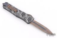 This Combat Troodon OTF automatic features a satin finished D/E blade with a standard edge. Black aluminum handle with a tip down blasted stainless steel clip. Glass breaker. Comes with original box and papers. Excellent condition. Laser engraved and Art by PVK Vegas.