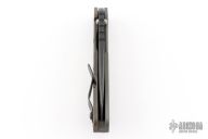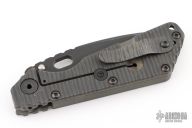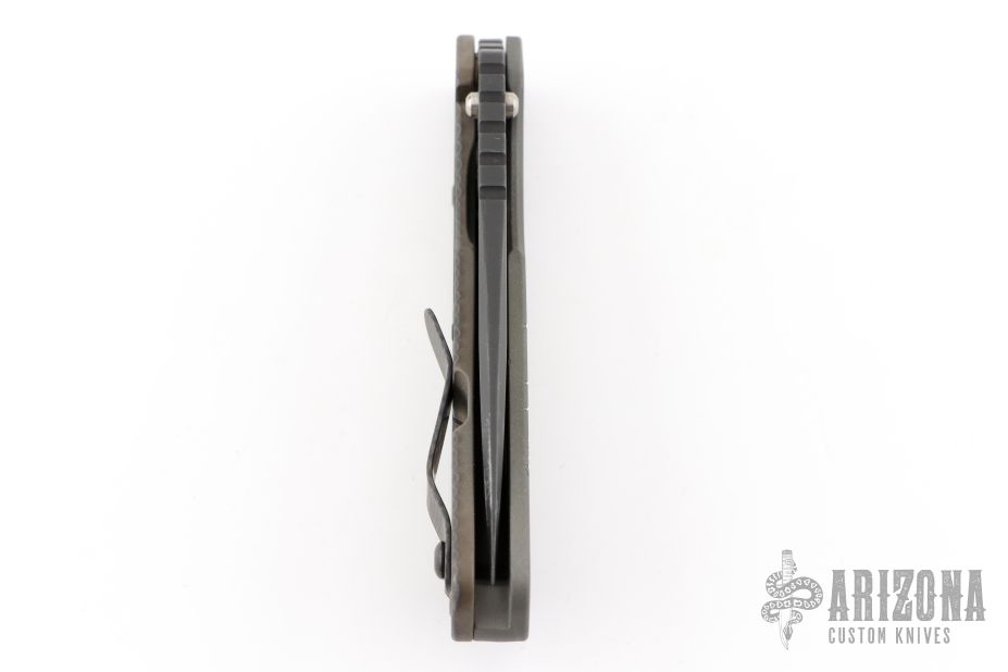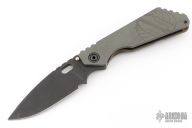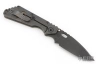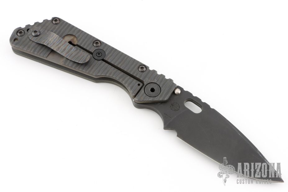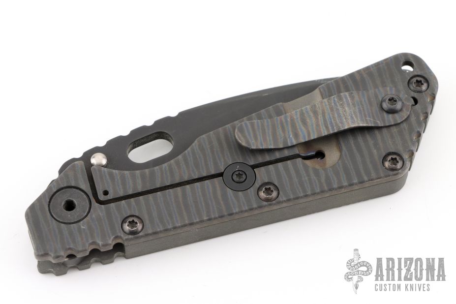 This Mick Strider SMF Fatty framelock folder features a black blade with thumbhole and notched thumbrest. The handle has a gray aluminum and flame finished titanium frame with titanium clip, tip up carry. Jimping on blade spine. Nice lockup, detent, and blade seating. Has some scuffs and scratches, otherwise good condition.