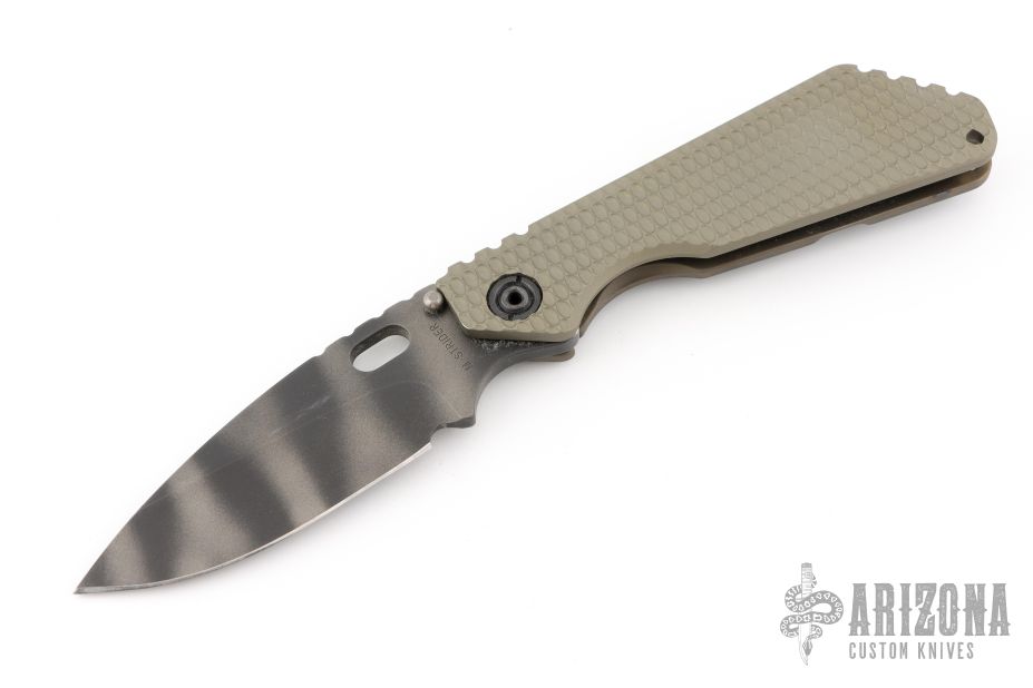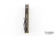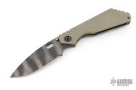 This SMF framelock folder by Mick Strider features a tiger striped drop point blade and a dimple pattern bronze aluminum and flamed titanium frame and tip up titanium clip. Includes a "Lock Bar Stabilizer" for maximum reverse lock retention. Nice detent, lockup and blade seating. Has a few light scuffs, otherwise excellent condition.