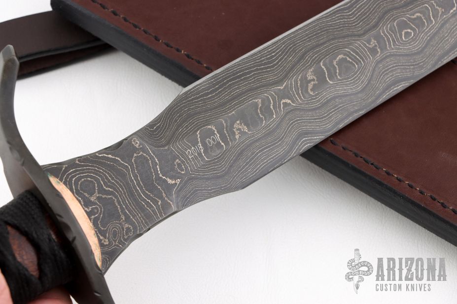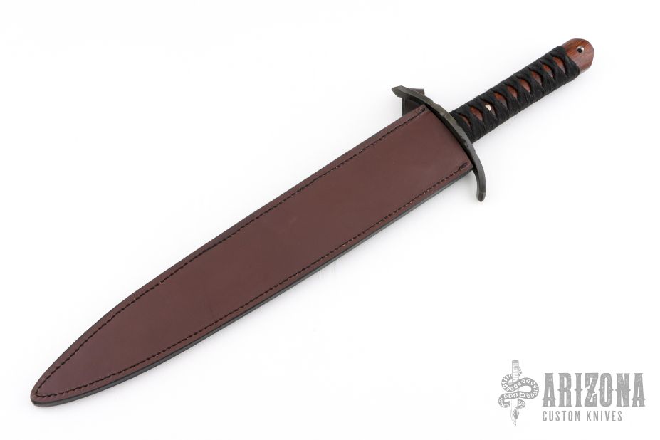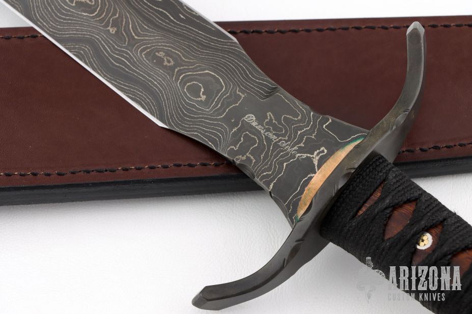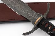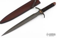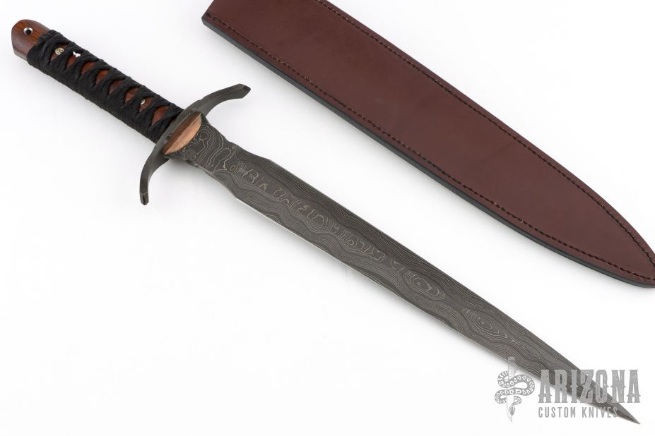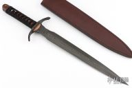 This One of a Kind Sword Dagger from Dawson Select features an American Made Damascus double edged blade with fileworked ricasso, .198" blade stock and 1.654" blade depth, full tang construction. The blade has a clear Cerakote on the blade. The handle has a fileworked black steel guard with polished "sunrise" copper accents, desert ironwood scales with mosaic pins, black synthetic silk wrapped grip, lanyard hole in the butt. Includes a COA and brown leather sheath dated 2018. Excellent condition.