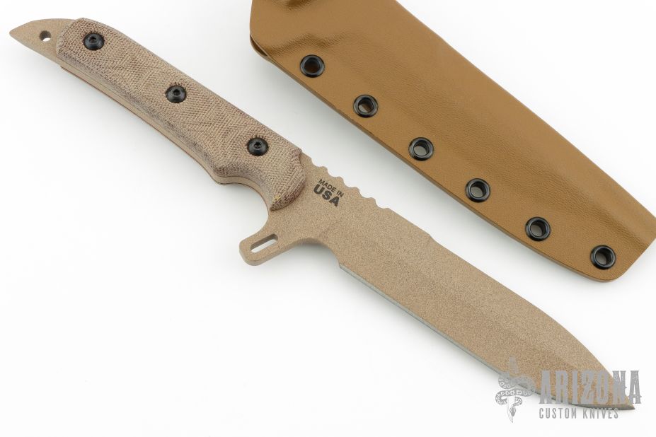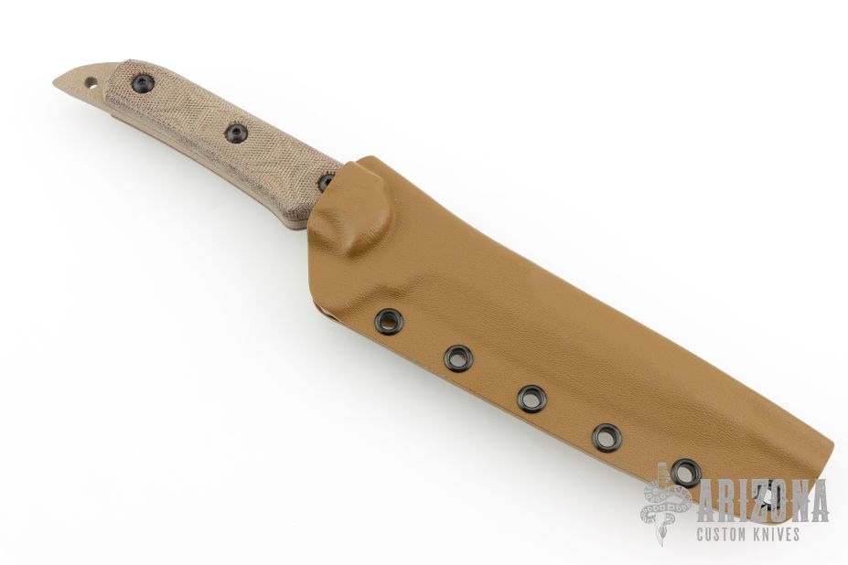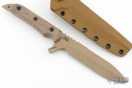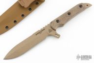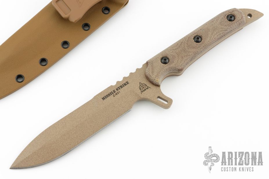 This missile strike by Tops knives features a tan coated blade with false top edge, .256" blade stock and 1.203" blade depth, full tang construction. The handle has brown canvas micarta scales with red liners. Comes with original Kydex sheath. Has some light scuffs, otherwise excellent condition. #Z-931