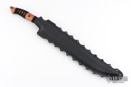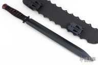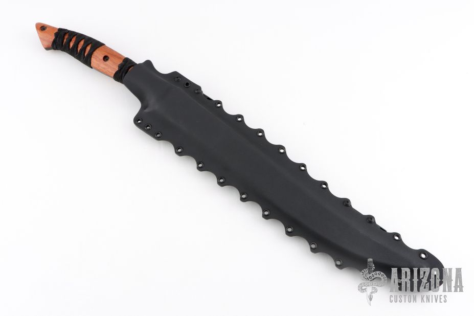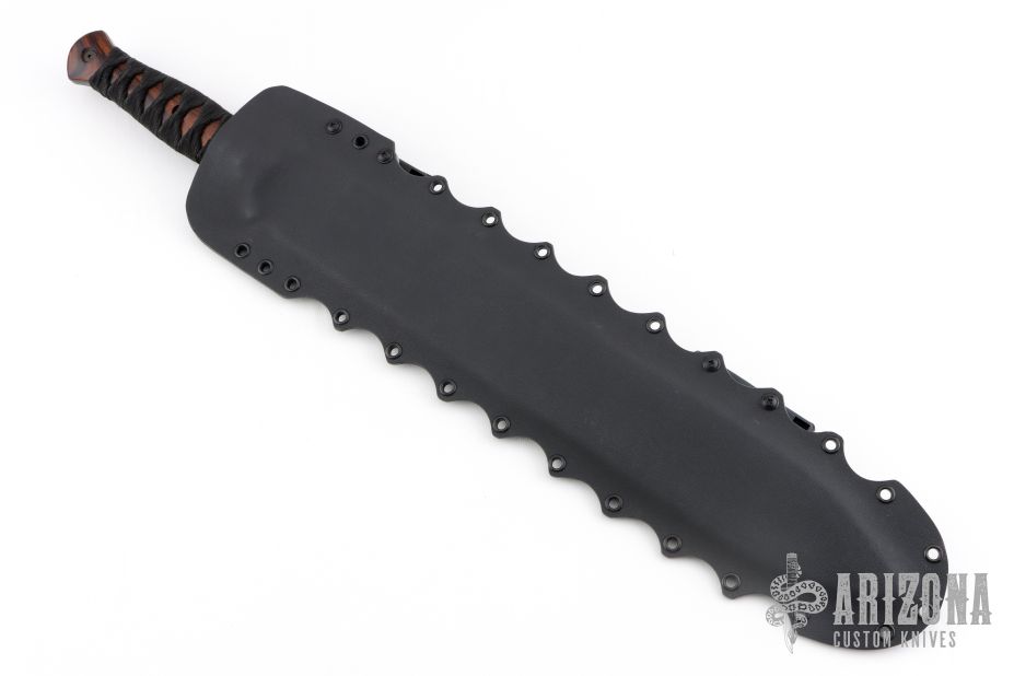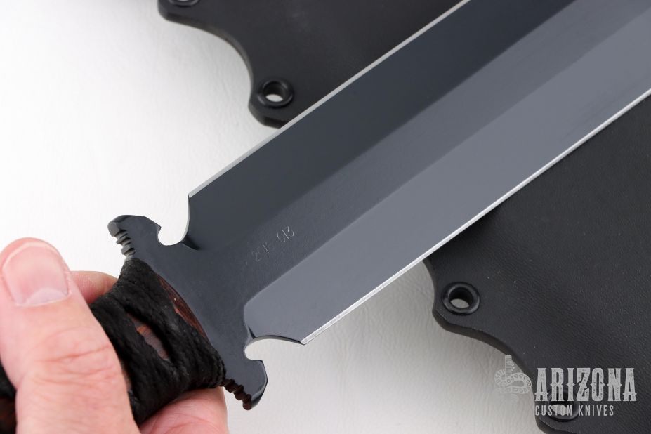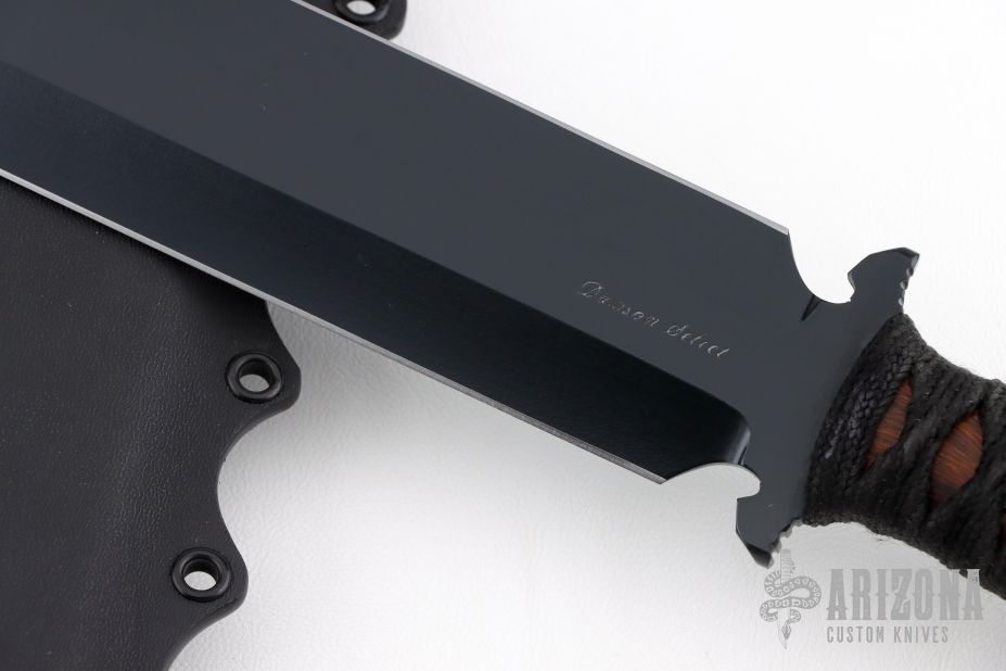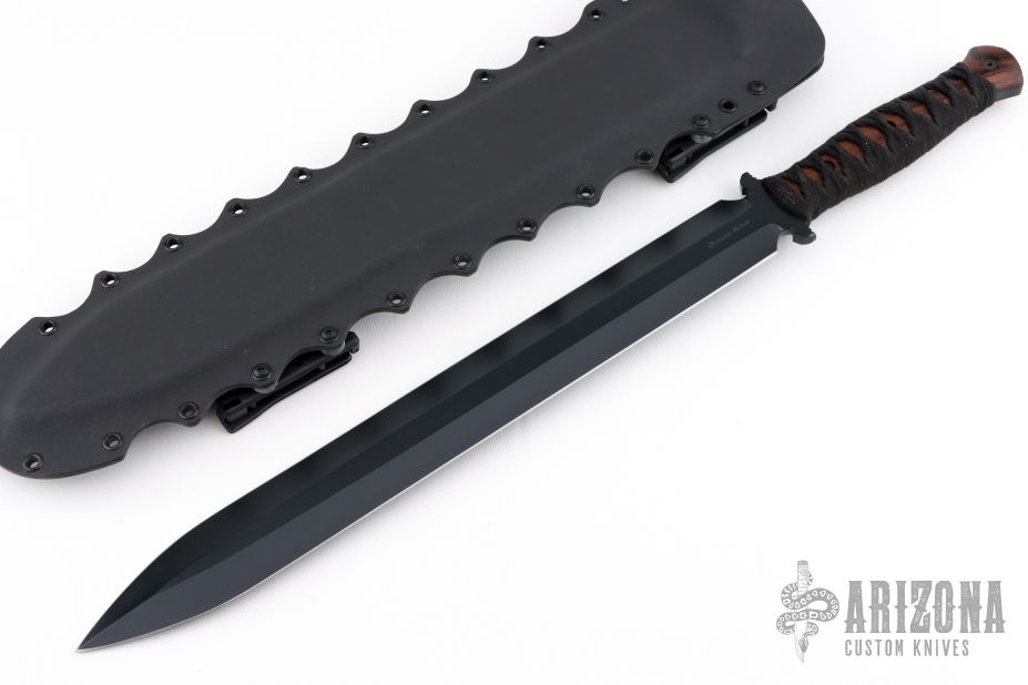 This Praetorian by Barry Dawson features a black cerakoted double edged blade, .270" blade stock and 1.865" blade depth, full tang construction. Handle has desert ironwood scales with black synthetic silk wrapped, notched finger rests. Comes with a kydex sheath and COA. Excellent condition.