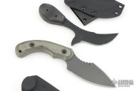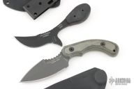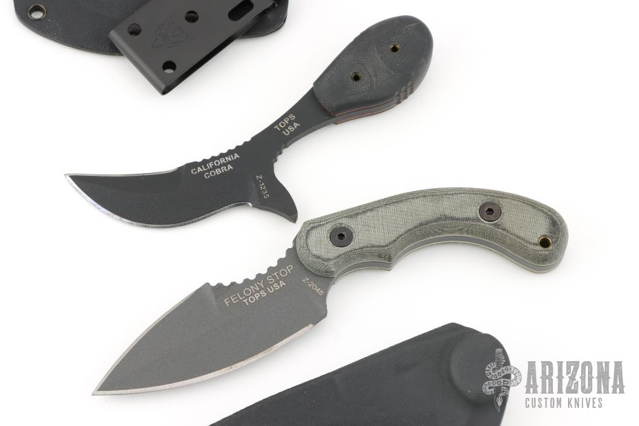 This Felony Stop is a Laci Szabo design produced by Tops, it has black linen micarta scales and white liners. Gray coated blade with both edges sharpened. Notched thumbrest. Includes black kydex sheath. Has a couple light scuffs, otherwise Excellent condition.