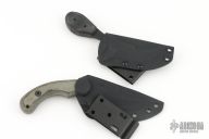 This California Cobra by Tops has black G-10 scales and red liners. Black coated blade with both edges sharpened. Notched thumbrest. Includes black kydex sheath. Has a couple light scuffs, otherwise Excellent condition.