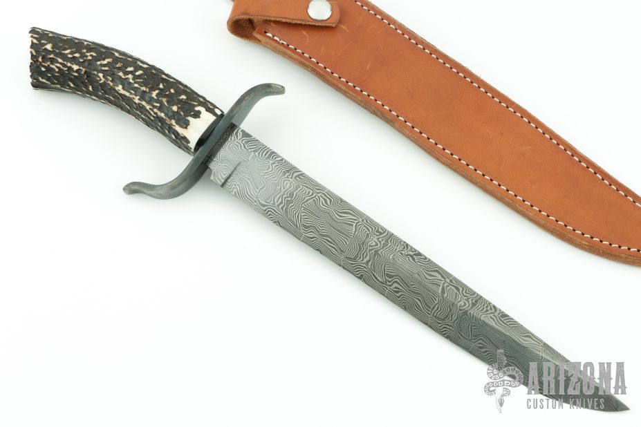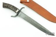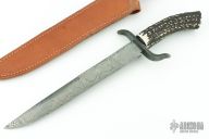 This knife features a Damascus blade with false top edge, .208" blade stock and 1.392" blade depth, hidden tang construction. The handle has a Damascus guard and a stag grip. Comes with a brown leather sheath. Has some light scratches, otherwise excellent condition.