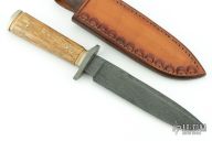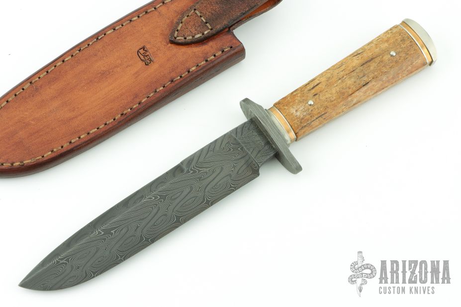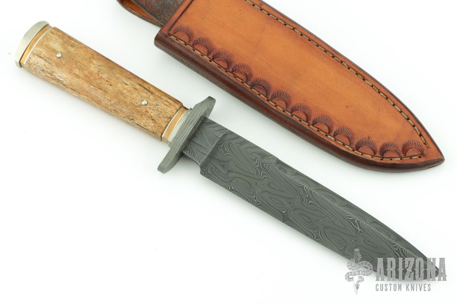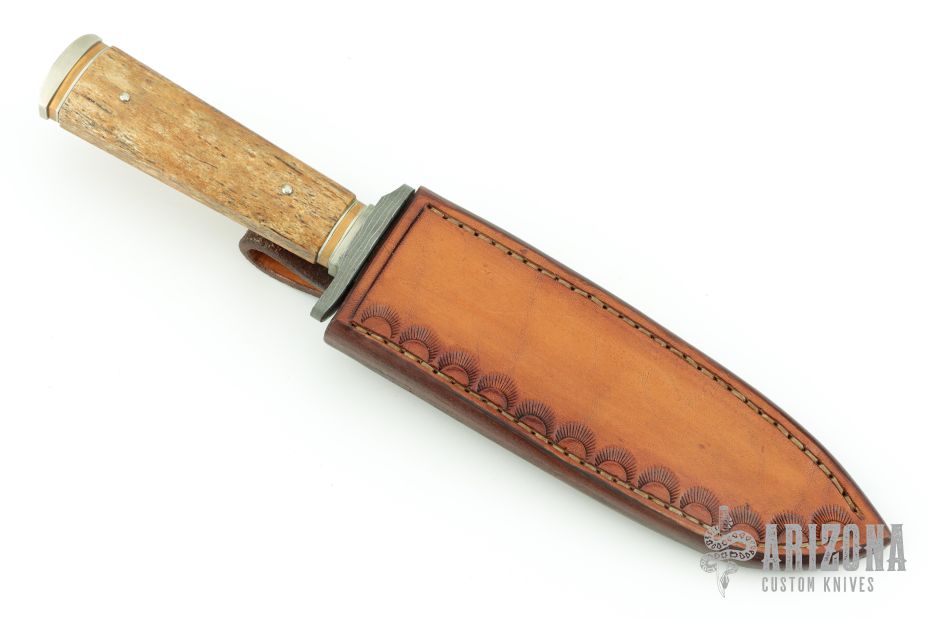 This bowie by Journeyman Smith Steve Myers Sr features a Mosaic Damascus blade with false top edge, .205" blade stock and 1.368" blade depth, hidden tang construction. The handle has a Damascus guard, nickel silver and brass spacer and butt, oosic grip. Comes with a hand tooled brown leather sheath. Excellent condition.