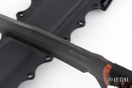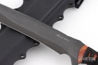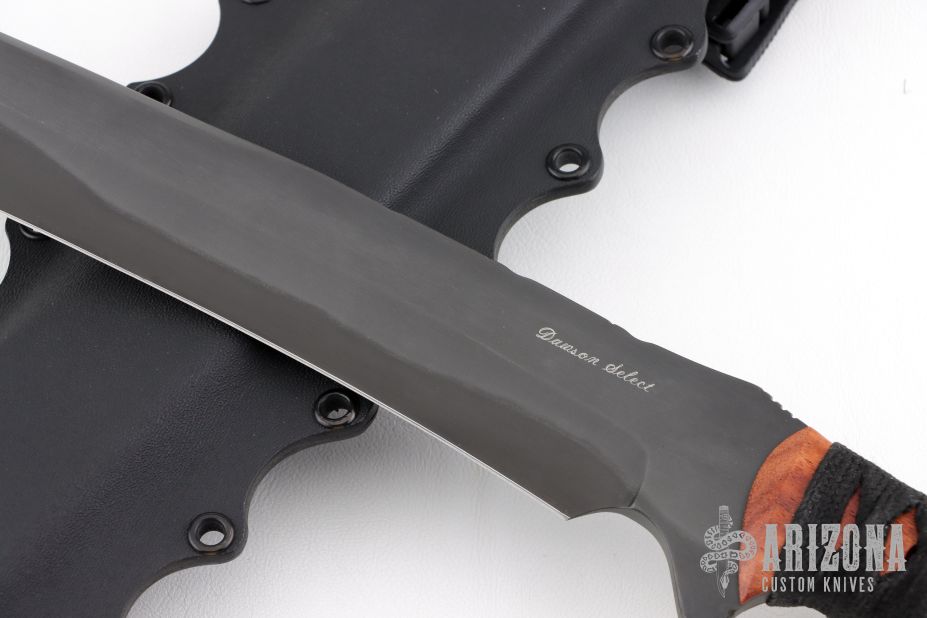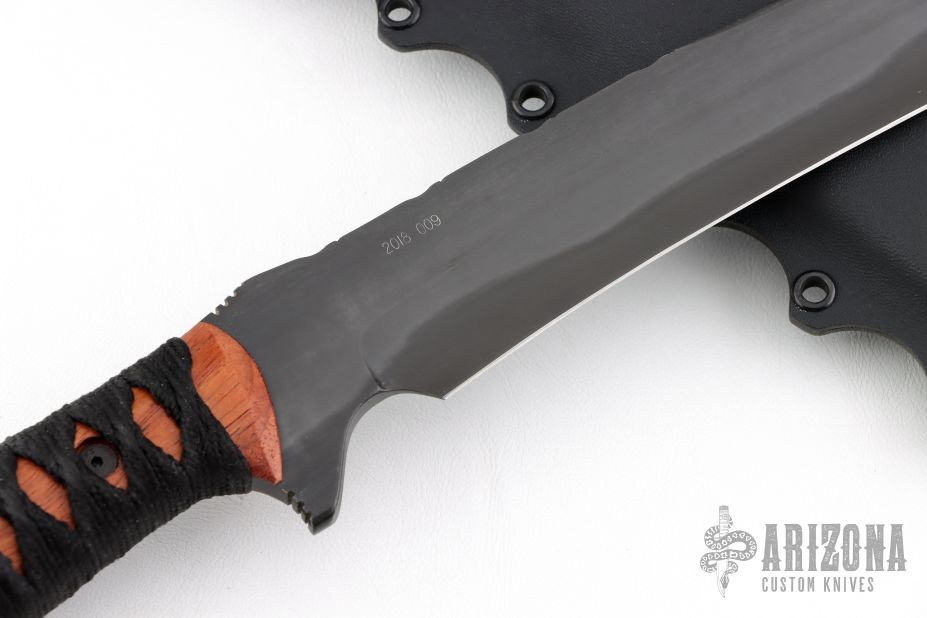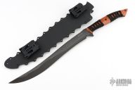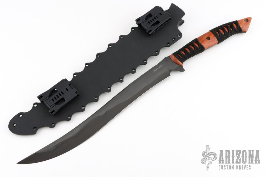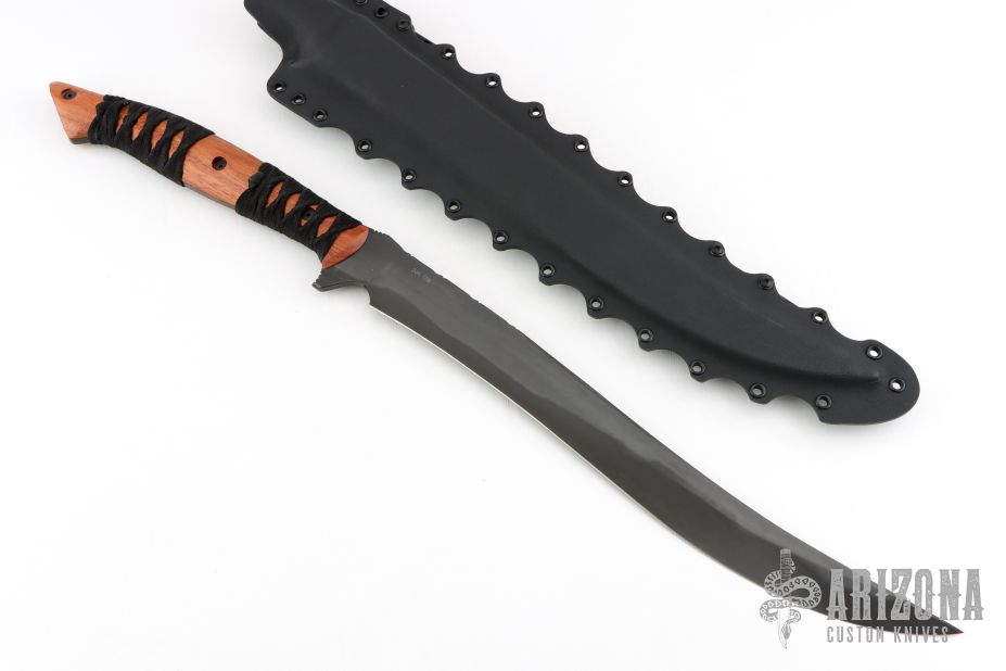 This Windstorm Sword from Dawson Knives features a recurve blade with nice hamon, a false top edge, notched thumbrest, and fileworked spine, .268" blade stock and 1.703" blade depth, full tang construction. The handle is comprised of black Japanese style wrap over exotic wood scales. Includes a kydex sheath. Excellent condition. "2018 009" on the blade.