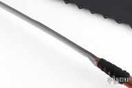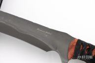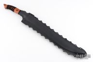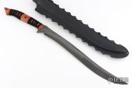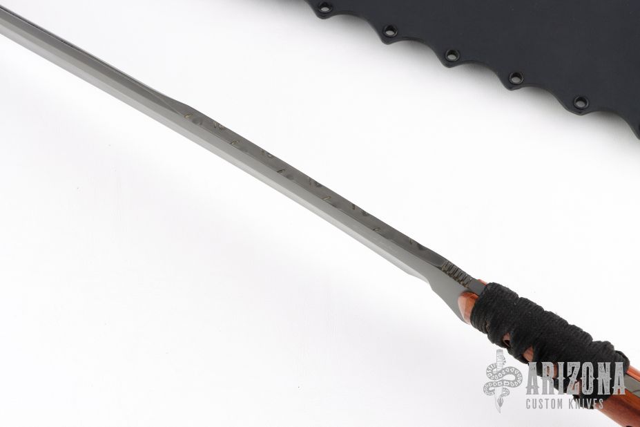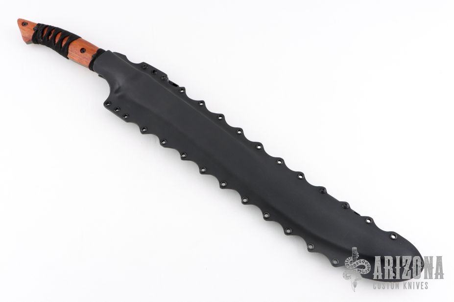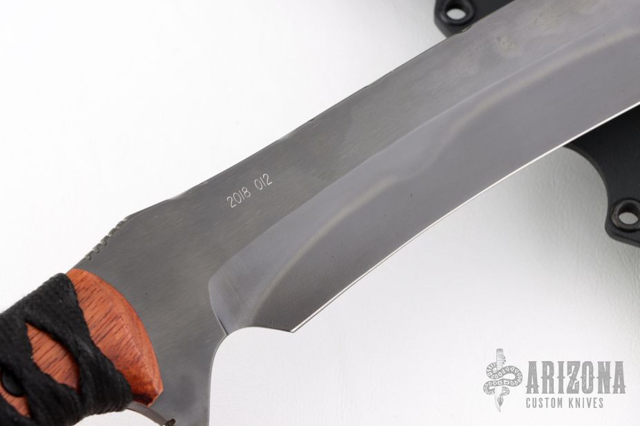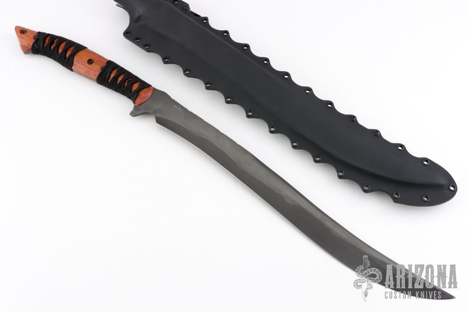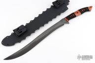 This Windstorm Sword from Dawson Knives features a recurve blade with nice hamon, a false top edge, notched thumbrest, and fileworked spine, .268" blade stock and 1.703" blade depth, full tang construction. The handle is comprised of black Japanese style wrap over exotic wood scales. Includes a kydex sheath. Excellent condition. "2018 009" on the blade.