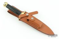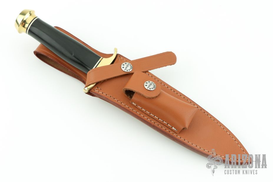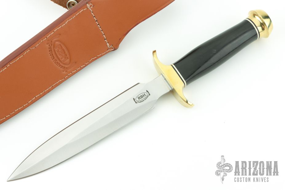 This Model 2 by RBH Custom Knives features a satin finished double edged blade with .192" blade stock and 1.291" blade depth, hidden tang construction. The handle has a brass guard, black wood grip with black/white spacers and a brass butt. Comes with a brown leather sheath. Excellent condition.