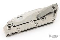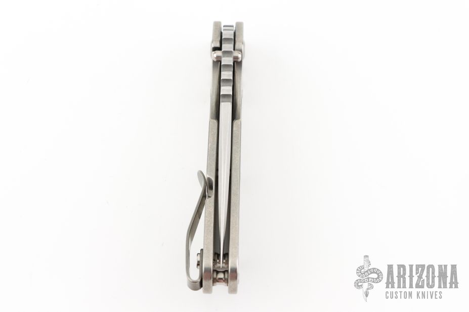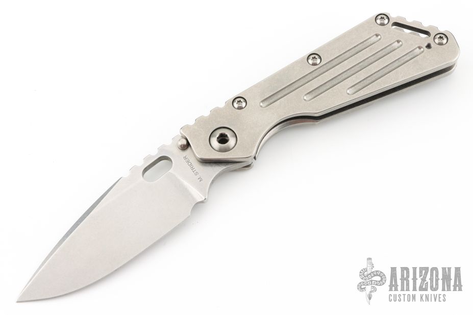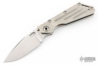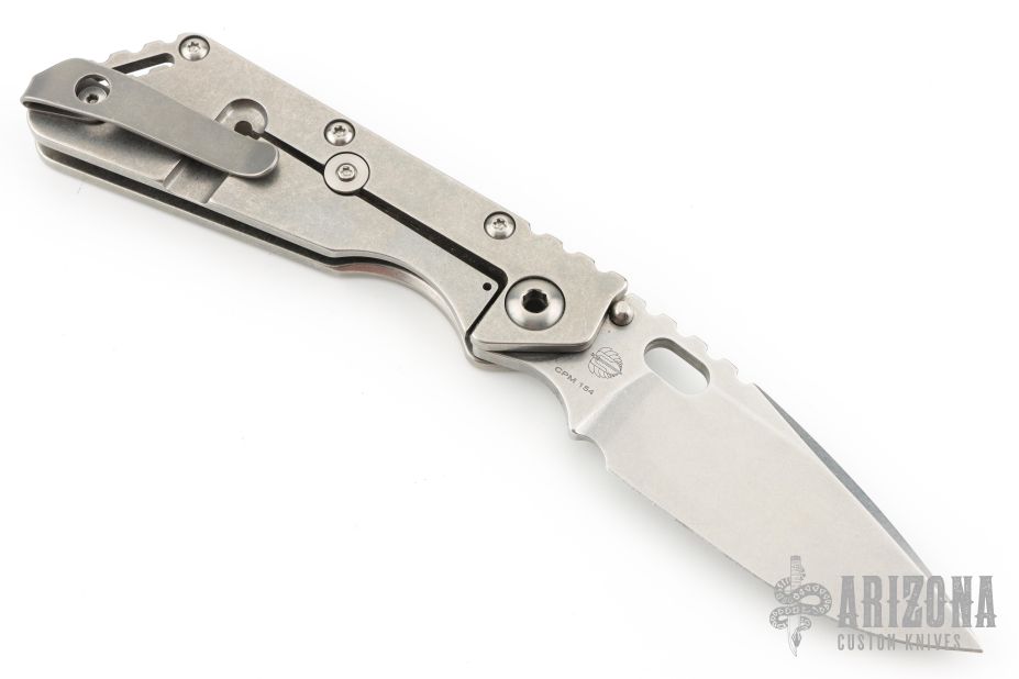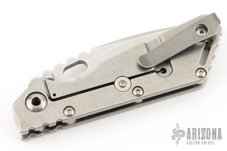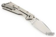 This Mick Strider Performance Series SMF framelock folder features a spear point 3/4 grind blade with thumbhole and notched thumbrest. The handle has a stonewashed titanium frame with titanium clip, tip up deep carry clip. Jimping on blade spine. Includes Hinderer "Lock Bar Stabilizer" for maximum reverse lock retention. Nice detent, lockup and blade seating. Has a couple light scratches on the clip, otherwise excellent condition.