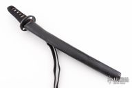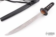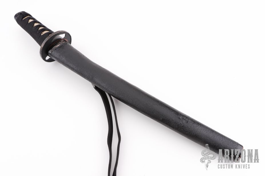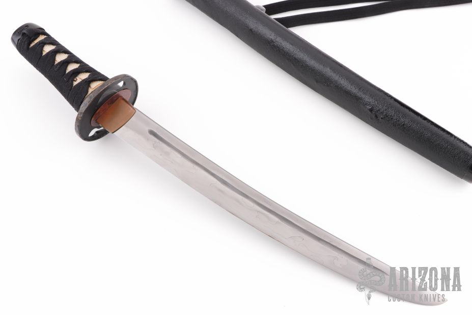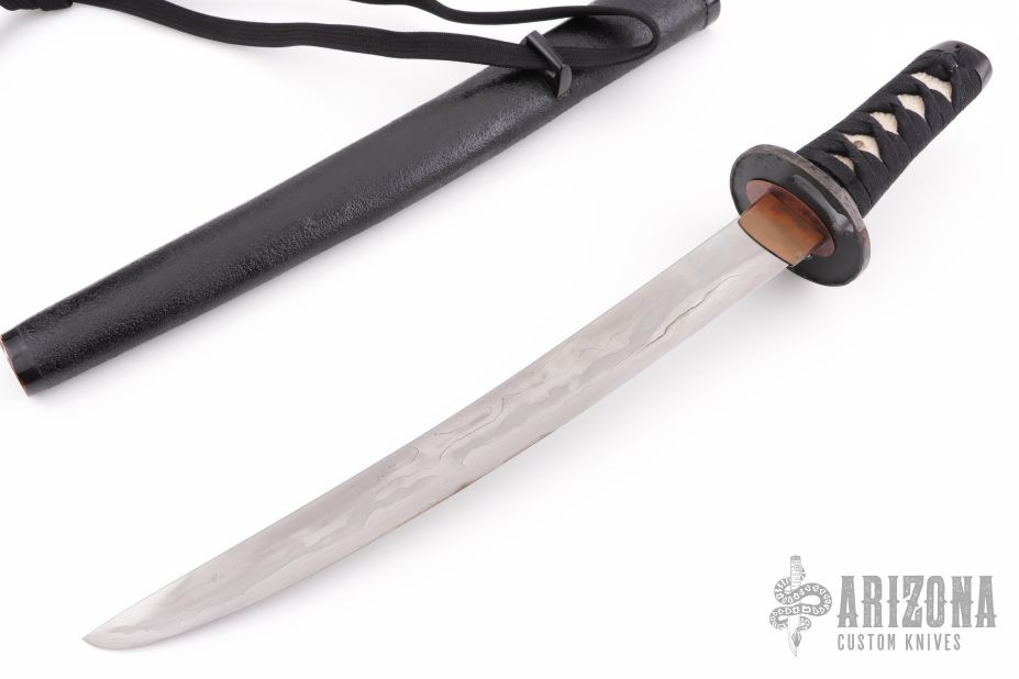This Heavy Wakizashi by Kaji Customs features a Damascus blade with Hamon made from 11 layers of 1095 and wrought iron, has a fuller or Bo-Hi on one side of the blade, .277" blade stock and 1.274" blade depth, hidden tang construction. The handle has a copper habiki, iron tsuba, white stingray skin and black suede tsuka-ito, copper kashira. Comes with a black Ishire lacqured wood says with buffalo horn koiguchi. New from maker. Comes with hand written material list.
