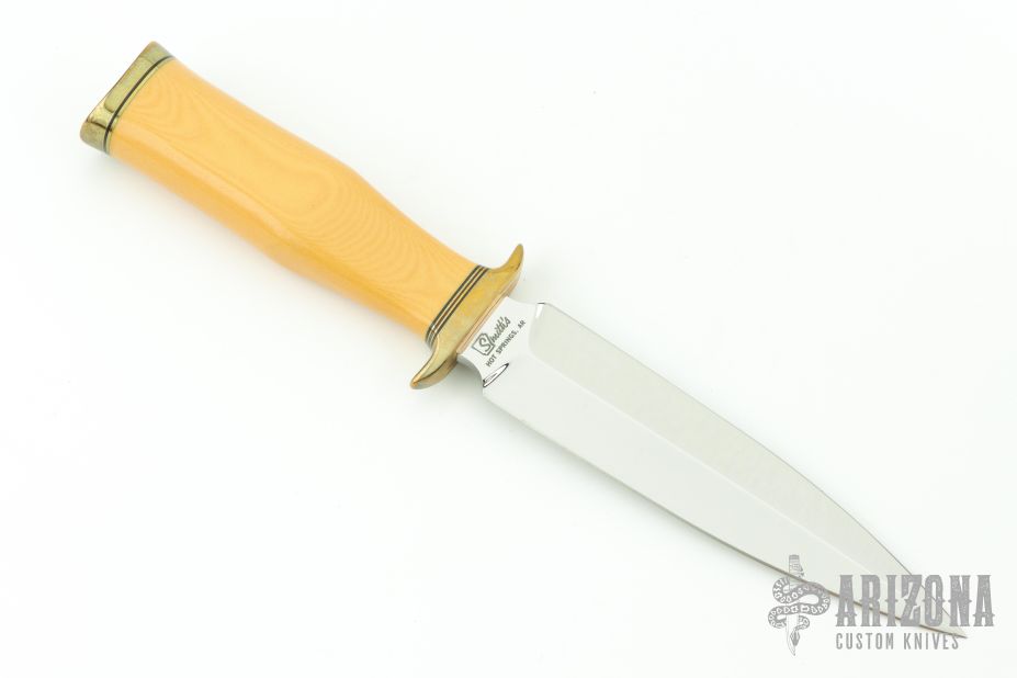 This dagger by Gil Hibben features a mirror finished double edged blade with .183" blade stock and 1.246" blade depth, hidden tang construction. The handle has vintage paper micarta grip, brass guard, and brass butt. Has a couple very light scratches, excellent condition otherwise.