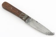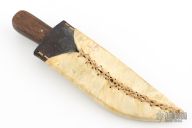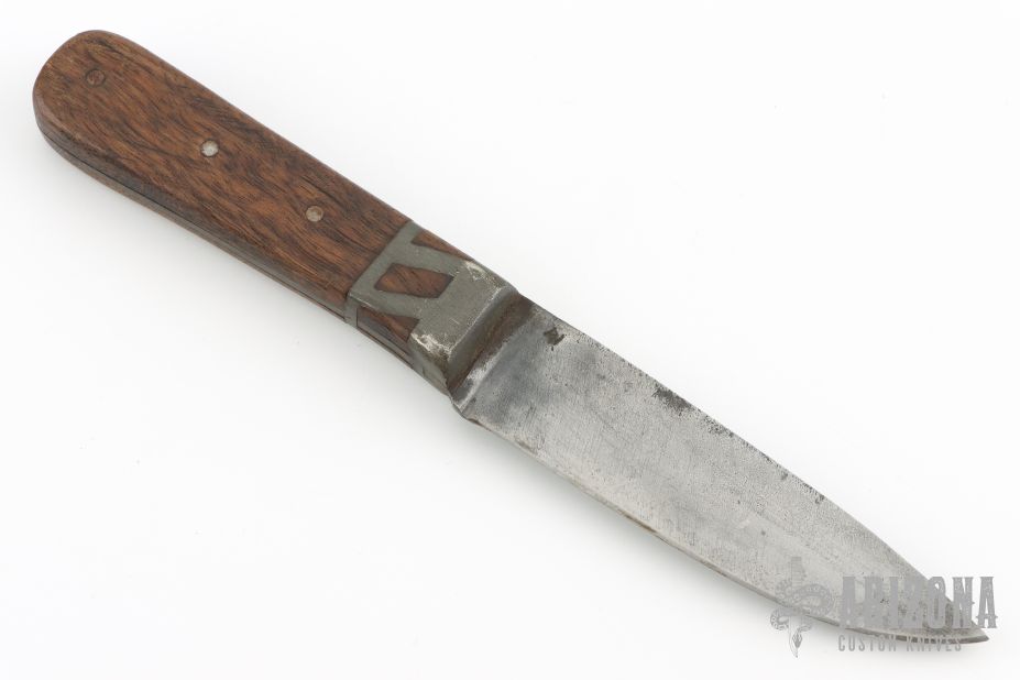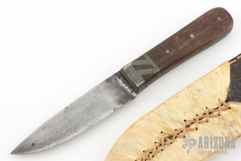 This knife by Daniel Winkler features a drop point blade with .145" blade stock and 1.061" blade depth, full tang construction. The handle has lead bolster/detailing guard and pinned wood grip. Comes with basic Shook sheath. Sheath has some unraveling in the belt loop stitching. The knife has some scratches, scuffs and patina. Great condition otherwise.