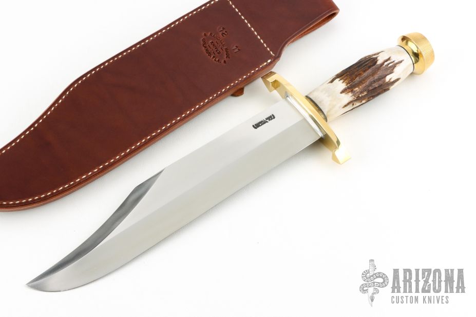 This Model 12-11 Smithsonian Bowie by Randall Made Knives features a satin finished carbon steel blade with sharpened top edge, .307" blade stock and 2.144" blade depth, hidden tang construction. The handle has a lugged brass guard, stag grip, blackspacers, brass butt cap. Comes with a brown leather sheath and a zippered case. Excellent condition.