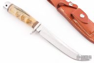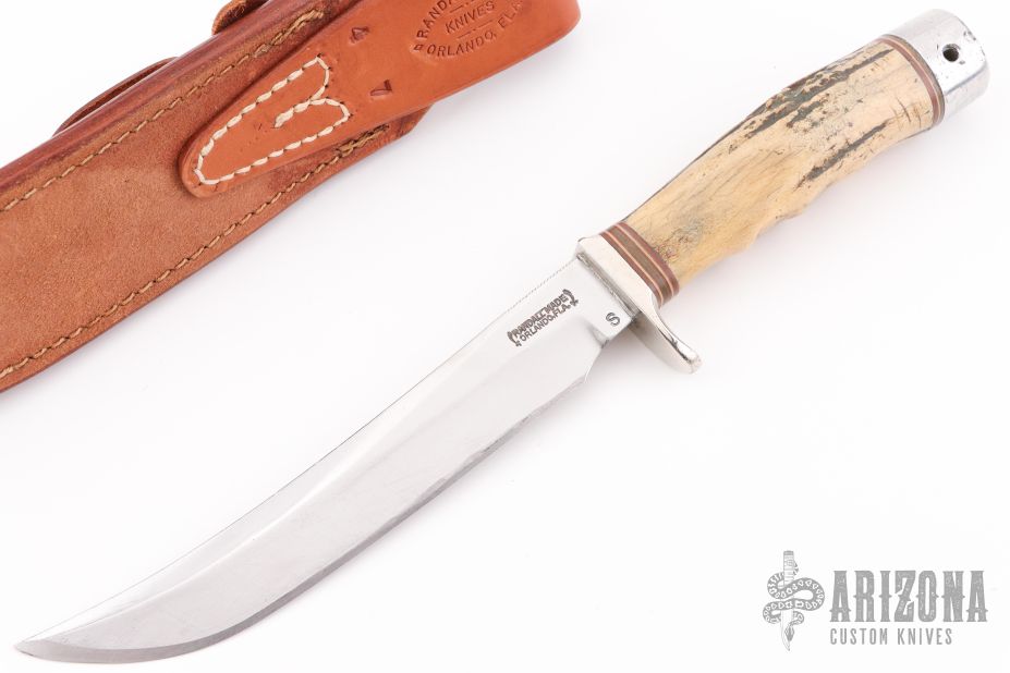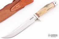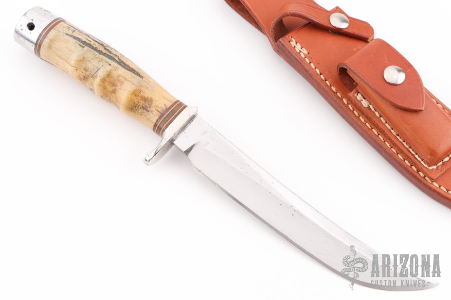 This Model 4-7 Big Game Skinner by Randall Made Knives has a satin finished blade with false top edge and notched thumbrest, .242" blade stock and 1.094" blade depth, hidden tang construction. The handle has nickel silver guard, finger groove stag grip and a duralumin butt with lanyard hole, 7 red/white/blue spacers. Comes with a Johnson Roughback brown leather sheath and a zippered case. Has been used, resharpened, has scuffs and scratches, some dings on the butt, otherwise good condition for its age.
