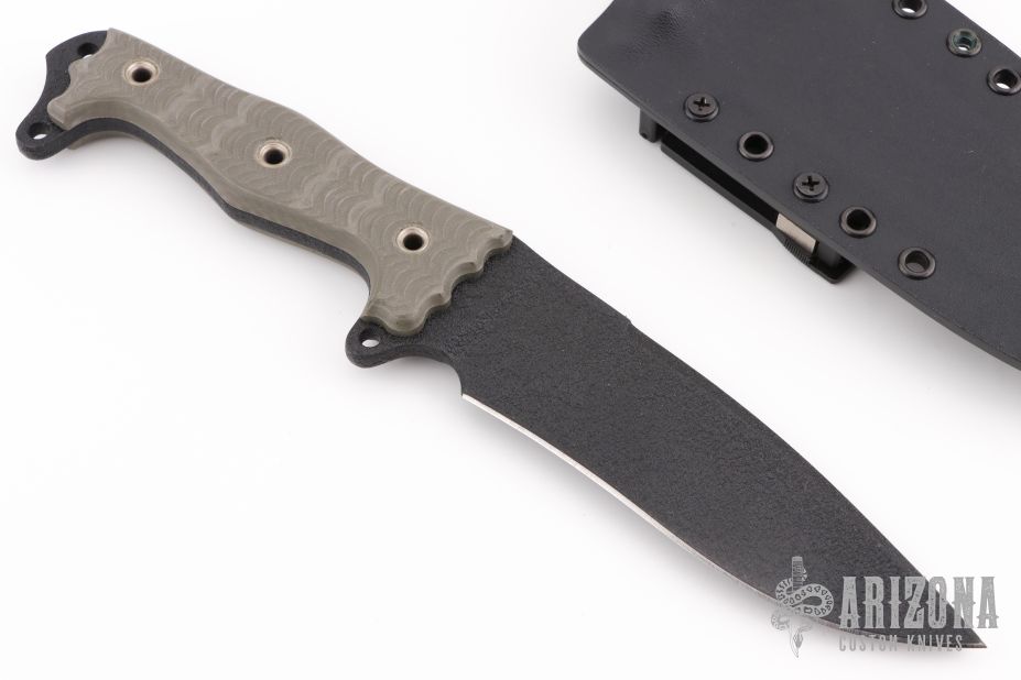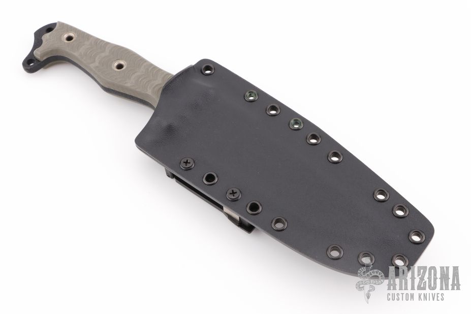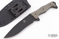 This Custom Shop ASH-1 Variant from Busse features a black coated blade, .229" blade stock and 1.775" blade depth, full tang construction. The handle has green G-10 scales with tube pins. Exposed tang pommel with lanyard holes. Comes with a custom kydex sheath. Excellent condition. The blade is recurved and the handle has been slimmed up.