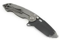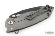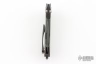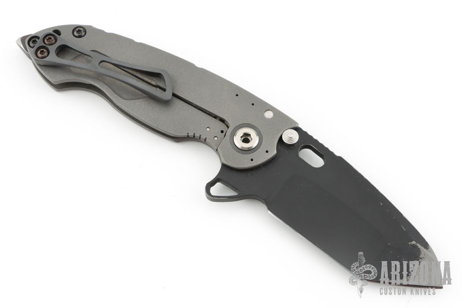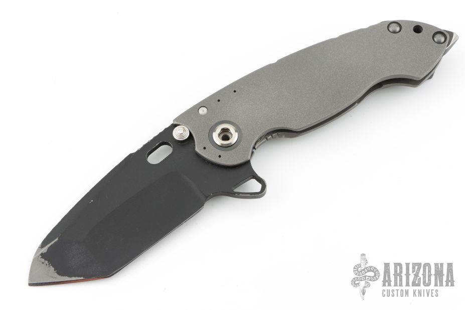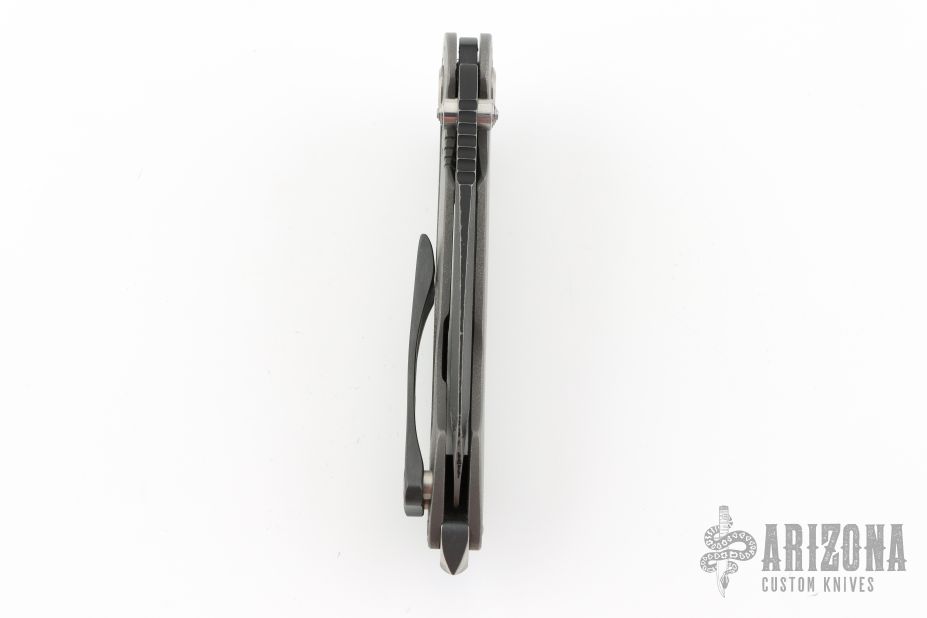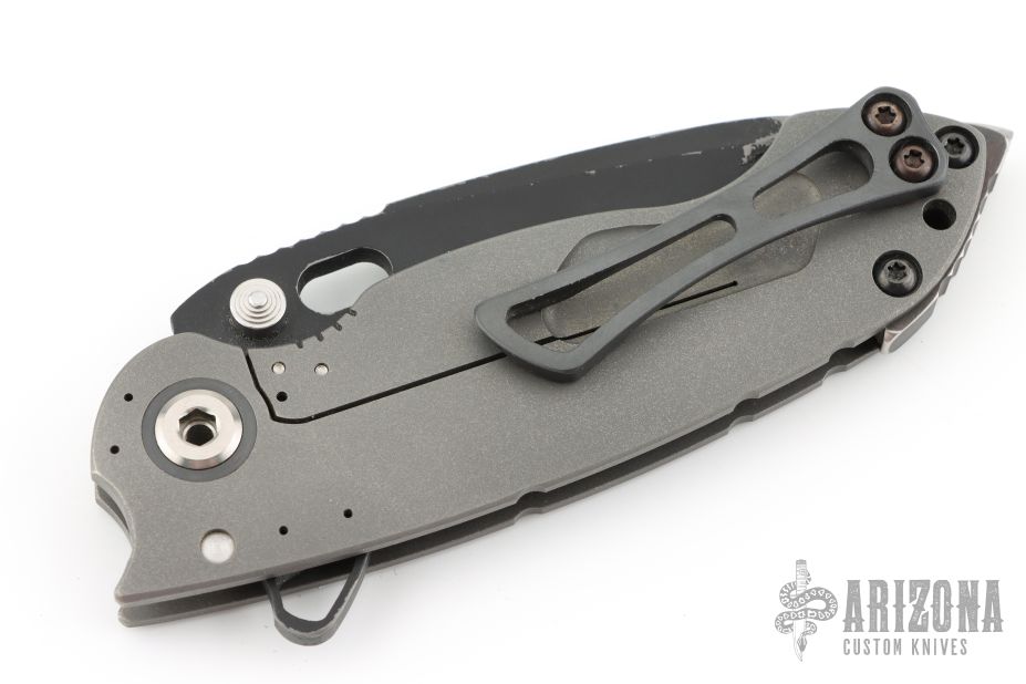 This Solo Flipper by Direware Custom Knives features a black coated tanto blade with swedge, notched thumbrest, dual blade stops and flipper. The handle has a bead blasted titanium frame, zirconium pivot collars and clip positioned for tip up carry, two-tone steel backspacer. Has some wear on the blade finish, and some light scuffs, otherwise good condition.