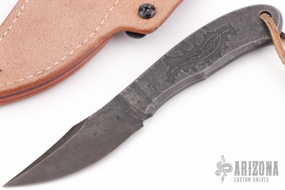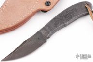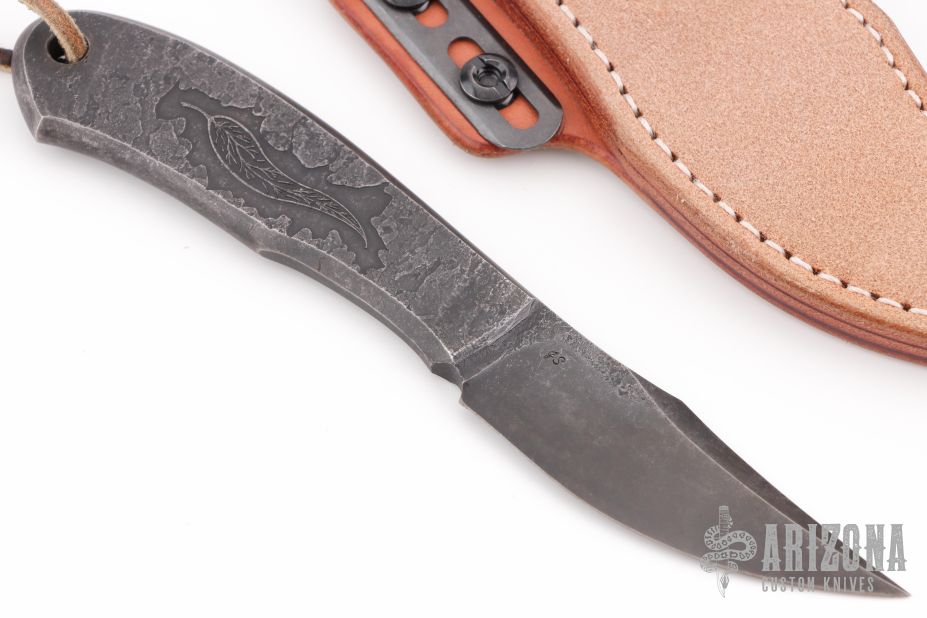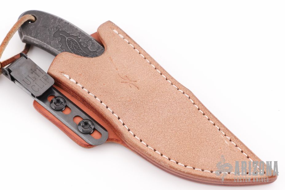This Element EDC by Curtis Haaland features a forged blade with false top edge and integral handle, .145" blade stock and .995" blade depth, lanyard hole at the butt. Comes with a brown leather sheath with Ulti-Clip. Excellent condition.
