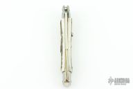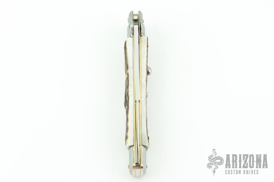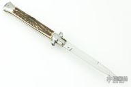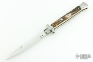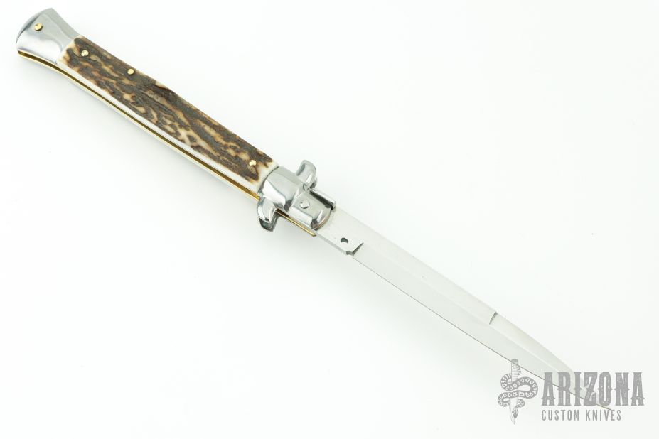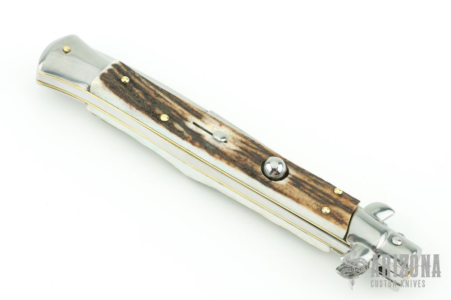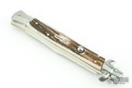 This 11" Swivel Bolster Auto by Frank Beltrame features a tumbled bayonet ground blade with false top edge. The handle has nickel silver bolsters, front and rear, stag scales, brass liners, stainless spring. Comes in Campolin leather sheath. Excellent condition.  This one was tuned and polished by Greg's Effects and has a COA.