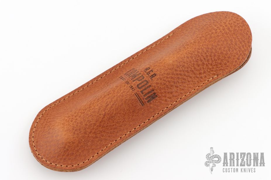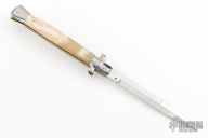 This 11" Swivel Bolster Auto by Frank Beltrame features a polished bayonet ground blade with false top edge. The handle has nickel silver bolsters, front and rear, honey horn scales, brass liners, stainless spring. Comes in Campolin leather sheath. Excellent condition. This one was tuned and polished by Greg's Effects and has a COA.