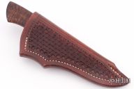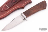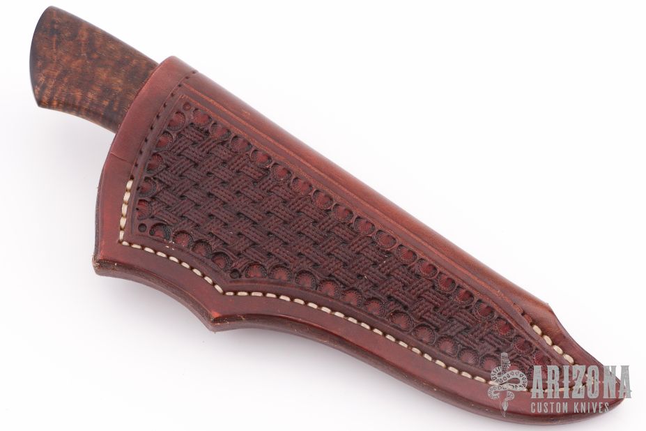 This Hunter by Journeyman Smith Charles Carpenter features a hand rub satin finished blade with .173" blade stock and 1.140" blade depth, hidden tang construction. The handle has a stainless steel guard and a Koa wood grip with a single stainless steel pin. Nicely contoured handle. Comes with a hand tooled brown leather sheath and zippered case. Has some light scratches and oxidation on the blade otherwise the knife is in excellent condition.