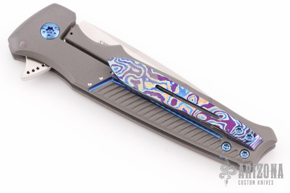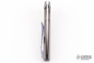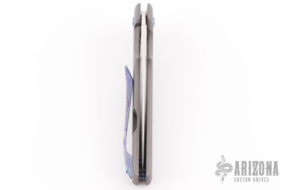 This Centron by Shane Sibert features a hand rub satin finished spear point blade with fullers and flipper. The handle has a bead blasted titanium frame with Mokuti tip up clip and anodized titanium hardware. Rides on bearings, nice detent, lockup and blade seating. Excellent condition. Comes with a zippered case and COA dated 1/2019