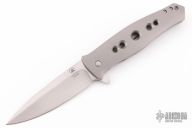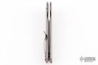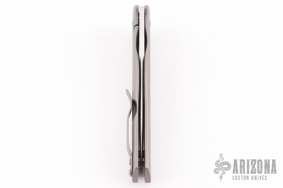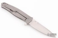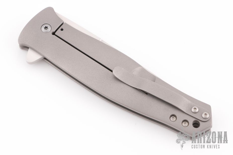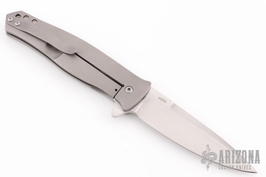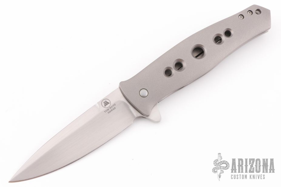This Dr. Death is a flipper by Tom Mayo. The Dr. Death flipper has very smooth action and good detent, lockup and blade seating. Bead blasted titanium frame with drilled hole accent, standoffs, lanyard hole. The blade is hand rub satin finished with flipper. Excellent condition. Comes with a velcro pouch.
