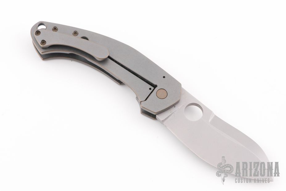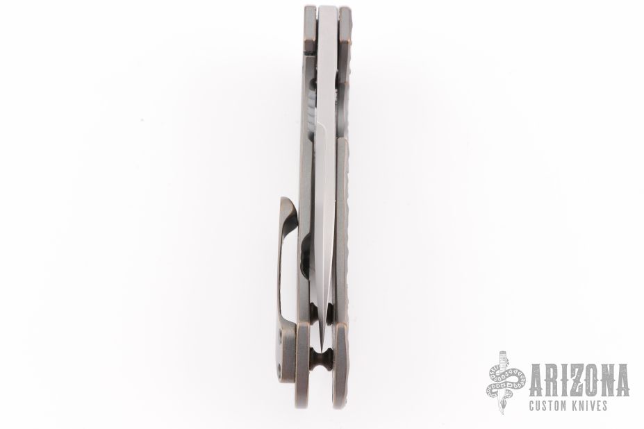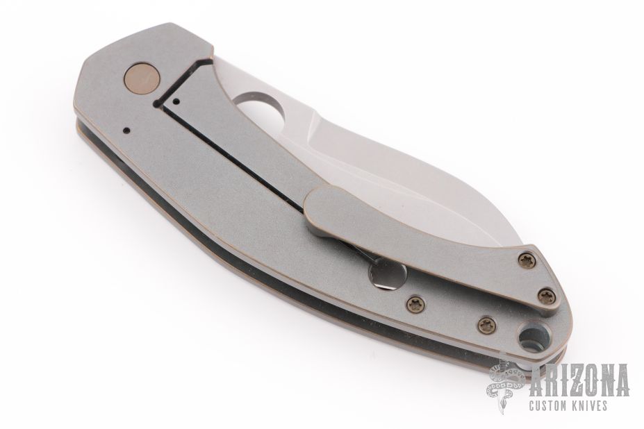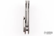 This Zero framelock folder by Jens Anso features a matte finished blade with thumbhole and asymmetrical swedge. The handle has a milled and anodized titanium frame, barrel spacers, and tip up clip. Nice detent, lockup and blade seating. Comes with Anso box. Excellent condition.