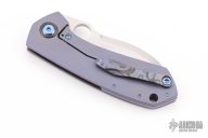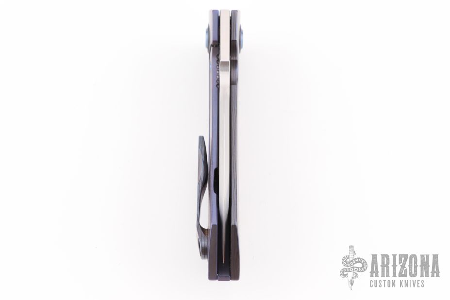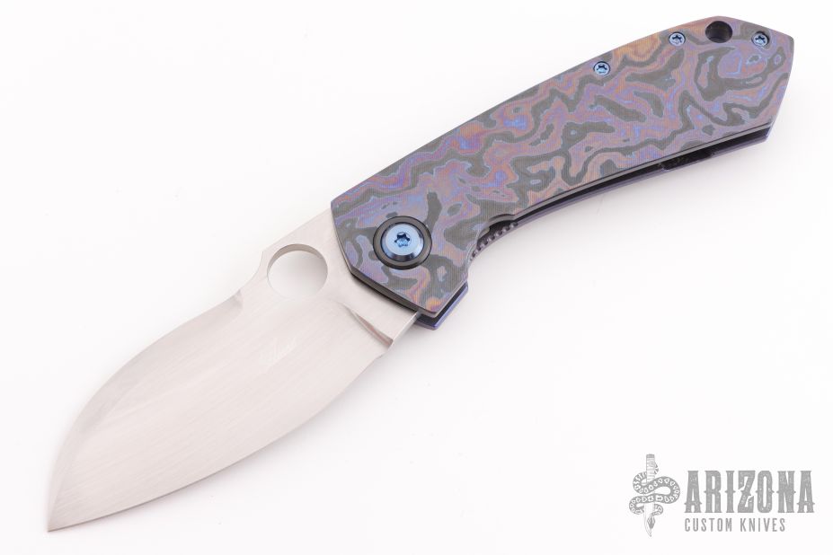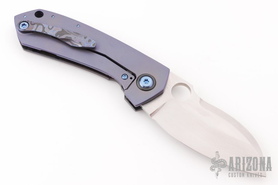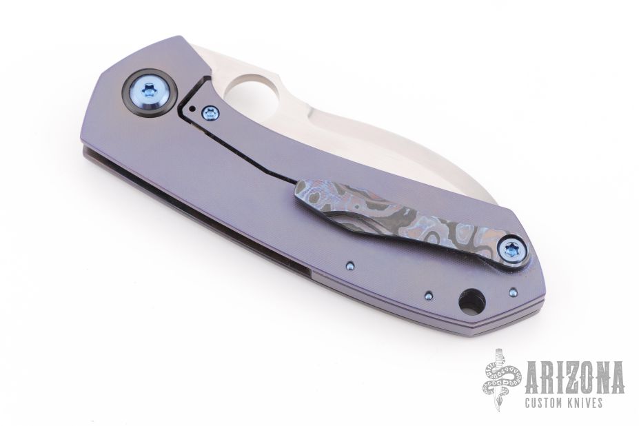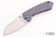 This Mojo framelock folder by Jens Anso features a hand rub satin finish sheepsfoot style blade with a thumbhole. The handle has a milled, anodized and stonewashed titanium frame with Black Timascus show side and a matching tip up pocket clip. Zirconium pivot collars, and titanium backspacer. Nice blade seating, detent, and lockup. Excellent work. Comes with original box, COA dated Jan 2022, and packaging. Excellent condition.