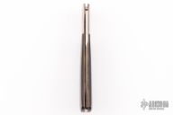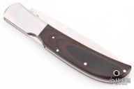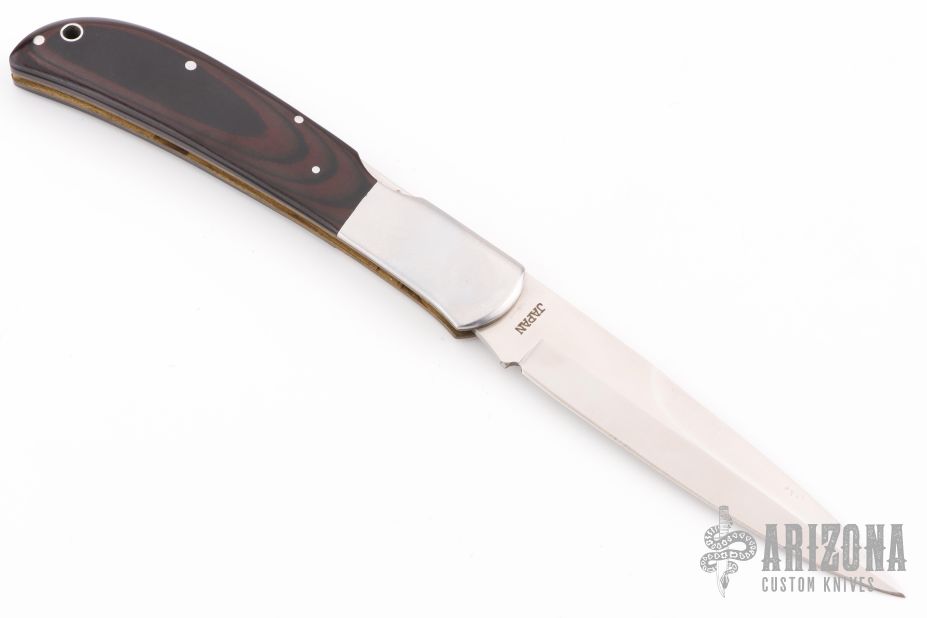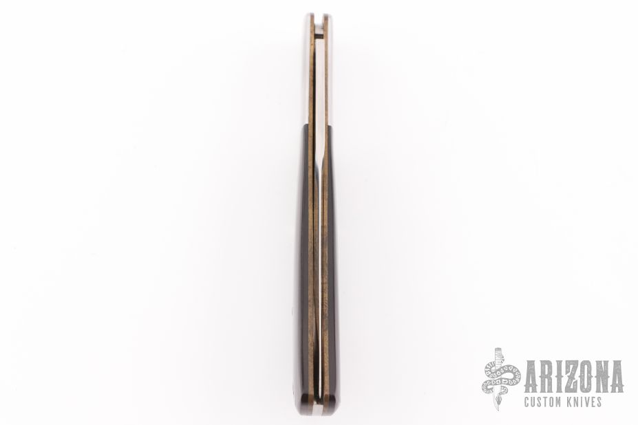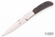 This lock back by Al Mar Knives has a satin finish blade with false top edge and a nail nick. The handle has stainless steel bolsters, black/brown paper micarta scales, brass liners. Strong lock up. A few light scratches, otherwise great condition.