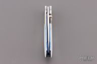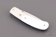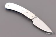 The knife has a hand rub satin finished blade, titanium bolsters, and mother of pearl scales. Includes original box and leather pouch. Has a few light scratches, otherwise excellent condition.