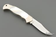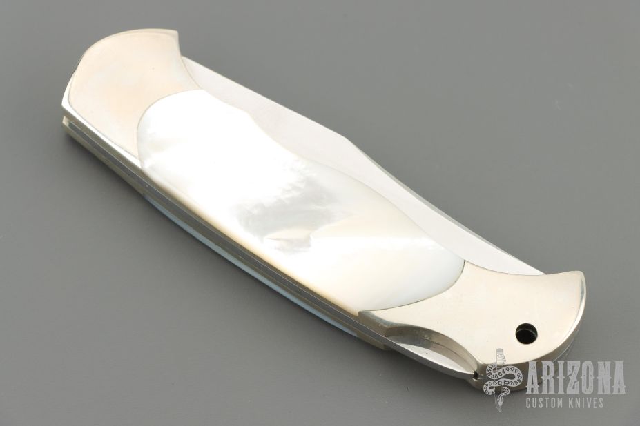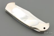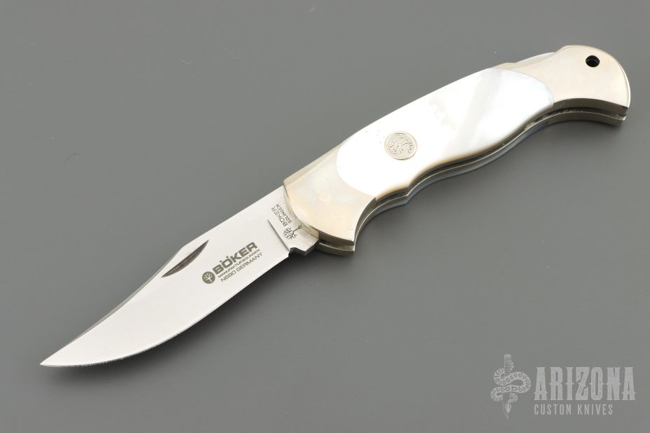 This knife by Boker features a clip point blade with nail nick. The handle has a nickel silver frame with mother-of-pearl inlays. Comes with original box and papers. Excellent condition.