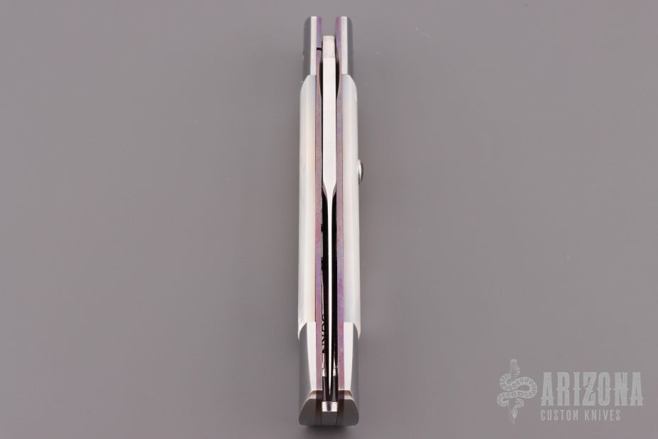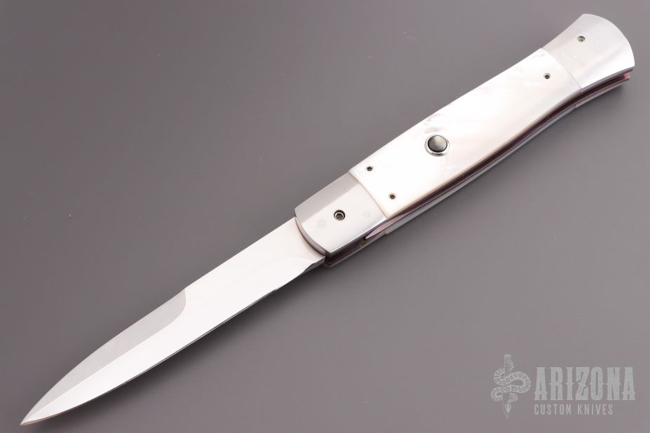 This Side opening auto by Burn Knives features a mirror polished bayonet style blade with false top edge. The handle has stainless steel double bolsters, mother of pearl scales over anodized titanium liners, black lip pearl button, stainless steel backspacer. Excellent condition.  Comes with a zippered case