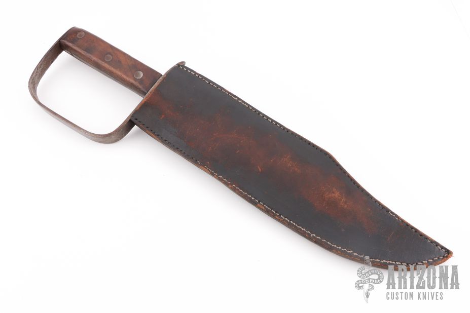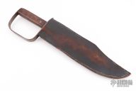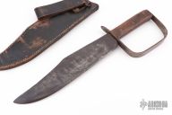 This D-Guard Bowie features a blackened forged clip point blade with .291" blade stock and 2.326" blade depth, full tang construction. The handle has a forged steel D-guard, dark wood scales and steel pins. Comes with a brown leather sheath with belt loop. Has some scratches and oxidation, not sharp, otherwise good condition. No markings on the knife or the sheath.