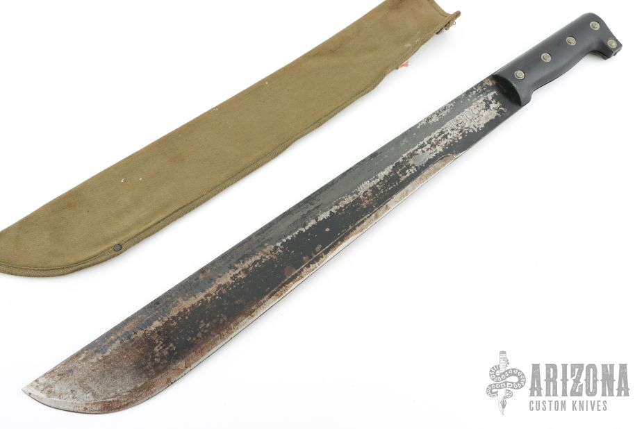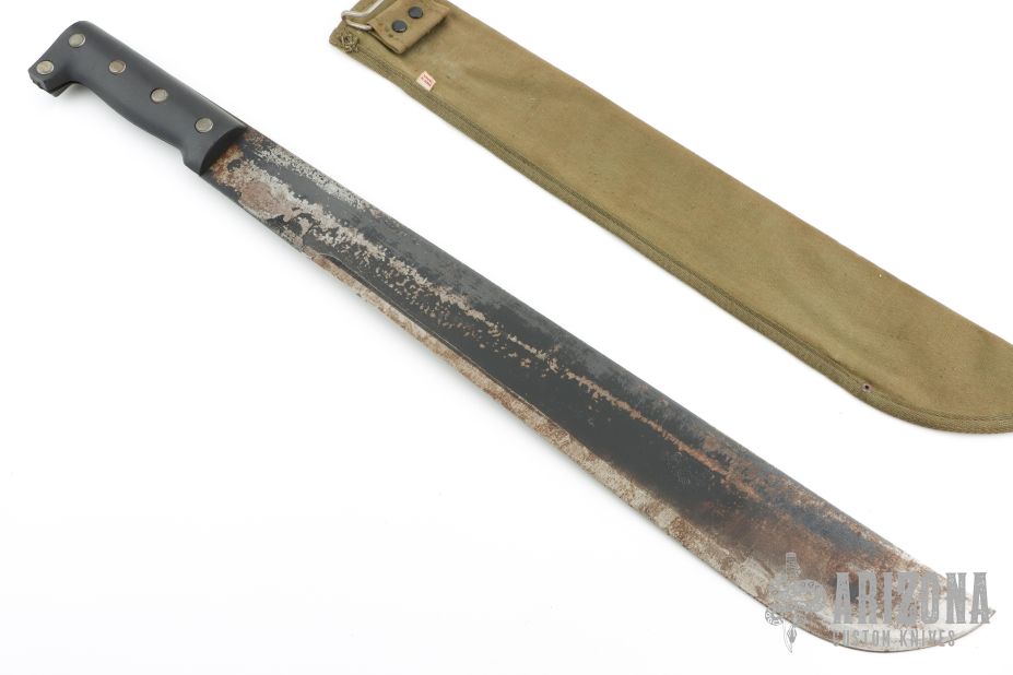 This awesome vintage machete knife comes with original canvas sheath for storing and travel, with a tag "MADE IN JAPAN". It measures overall 23" L and the cutting blade measures 18' L" x 2-1/4" H. It has black aluminum scales with five (5) rivets and measures 5" long. Has some wear on the finish, has been sharpened, but otherwise good condition.