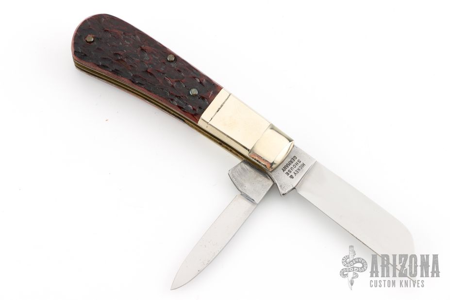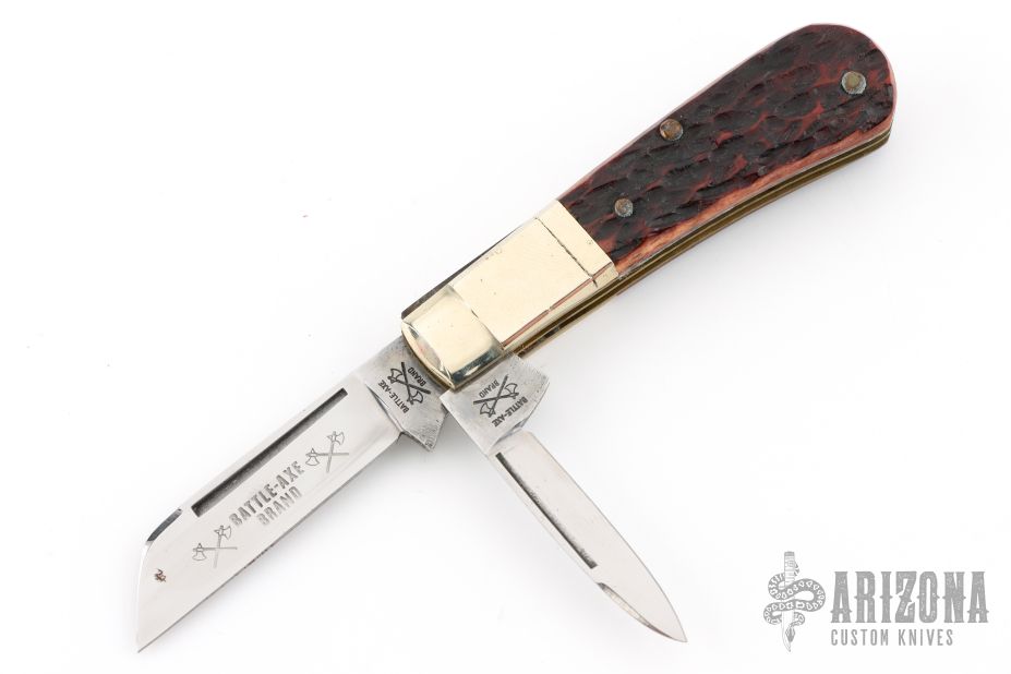We first​ started producing the Battle Axe Brand in 2021 once we finalized the trademark purchase. We came out with 2 traditional patterns based off of the old Battle Axe Patterns. There is a trapper and a large folding hunter. There were 5 handle materials made on each pattern: Buffalo Horn, White Jigged Bone, Green Jigged Bone, Red Jigged Bone and Stag. The 2021 models were 440 Stainless Blades while the 2022 Models were all D2 Tool Steel Blades. The 2022 Models came in Red Jigged and Red Sawcut Handle materials in the trapper version only.