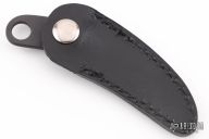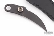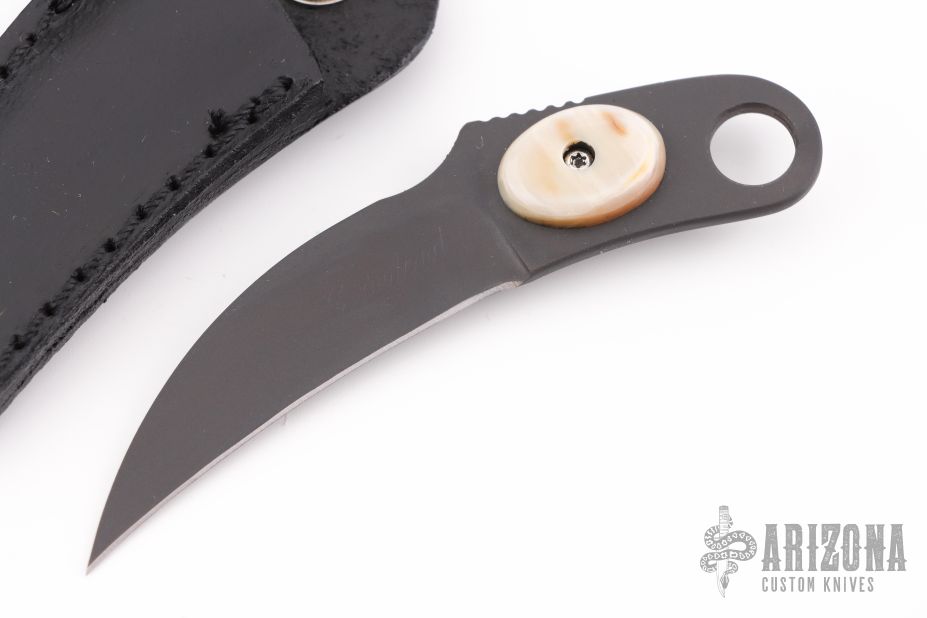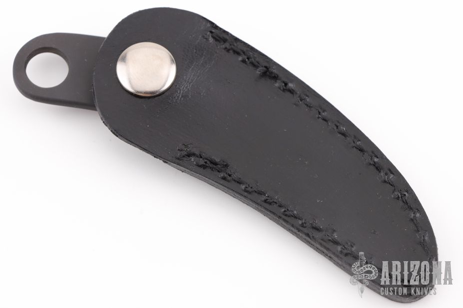 This Key Ring Claw from Pat Crawford features a DLC hooked blade and jimping on the thumb ramp. The handle has a musk ox scale on one side, and a button snap on the other to attach to the included black leather sheath. Excellent condition.