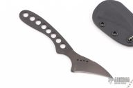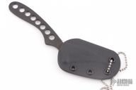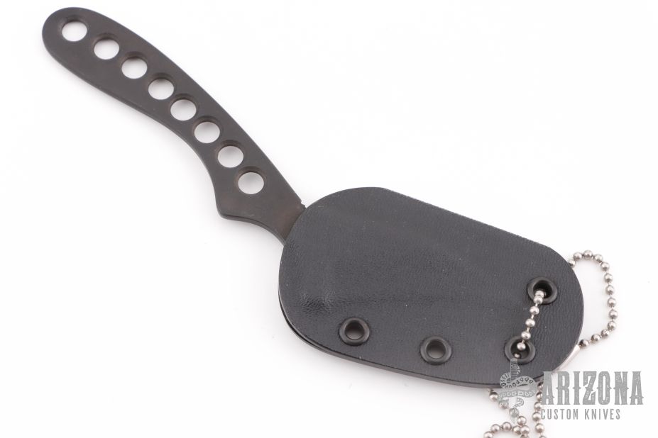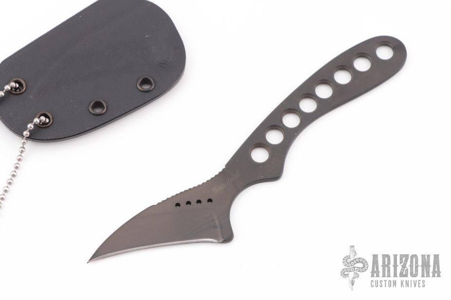 This Neck Knife from Crawford Knives features a DLC coated blade with swedge, notched thumb rest and deep choil for secure grip. The handle has been drilled out to reduce weight for ease of carry. Includes neck sheath with optional belt clip and ball chain. Has some scuffs, excellent condition.