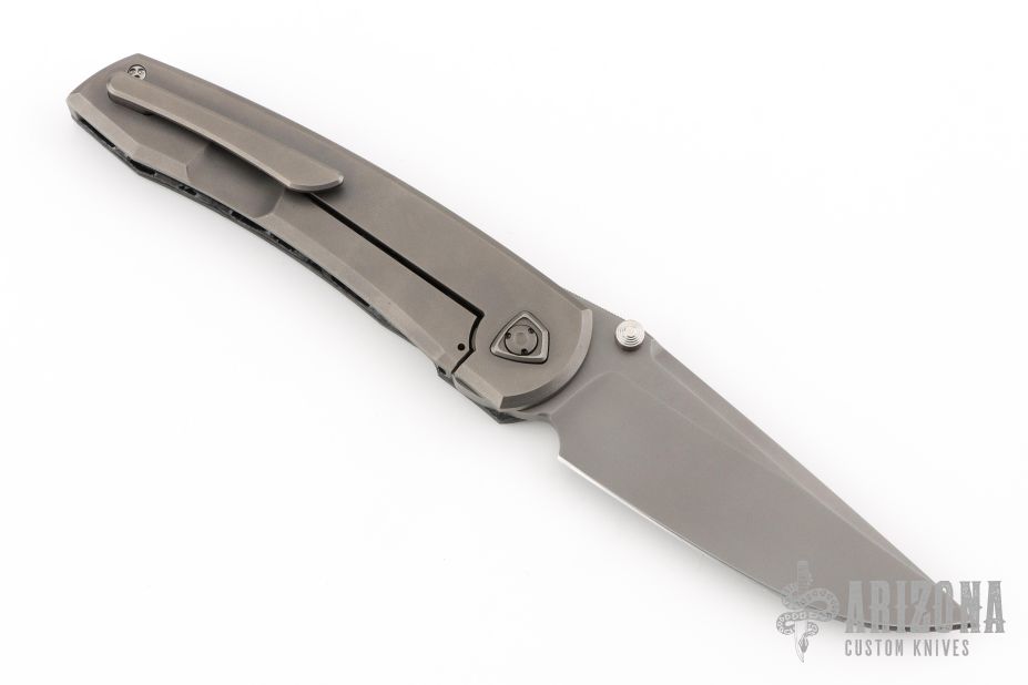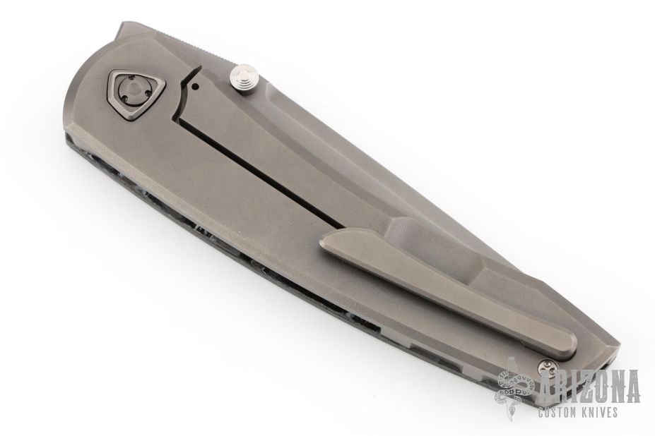 This Waka by Edison Barajas features a blasted blade with notched thumbrest and dual thumbstuds, can be front flipped. The handle has a chill vibes camocarbon and blasted titanium frame with matching backspacer and tip up clip. Has custom pivot. Rides on bearings, nice detent, lockup and blade seating. Comes with COA, dated 05-25. New from maker!