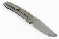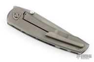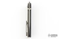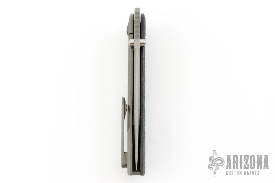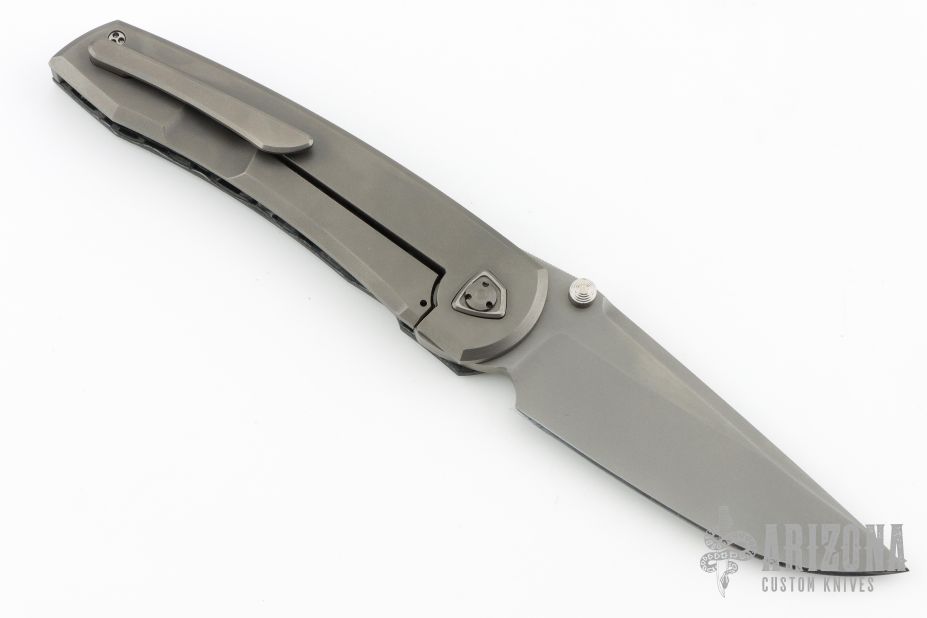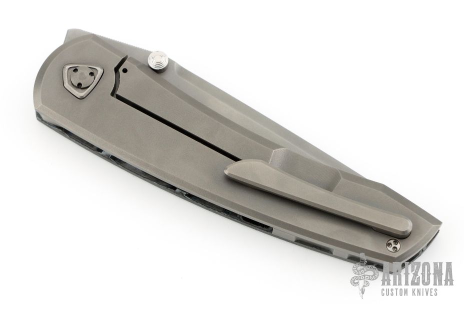 This Waka by Edison Barajas features a blasted blade with notched thumbrest and dual thumbstuds, can be front flipped. The handle has a chill vibes camocarbon and blasted titanium frame with matching backspacer and tip up clip. Has custom pivot. Rides on bearings, nice detent, lockup and blade seating. Comes with COA, dated 05-25. New from maker!