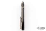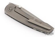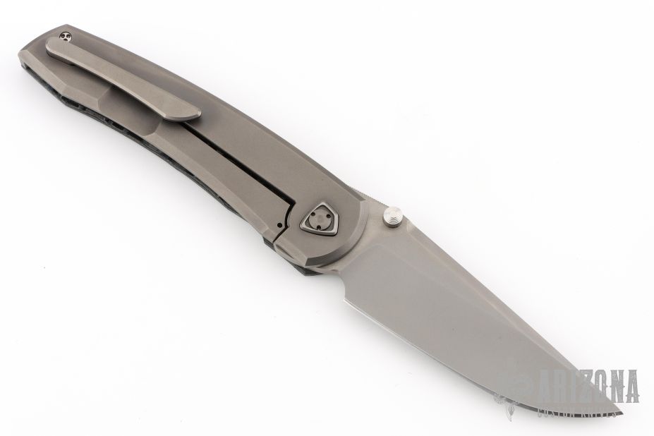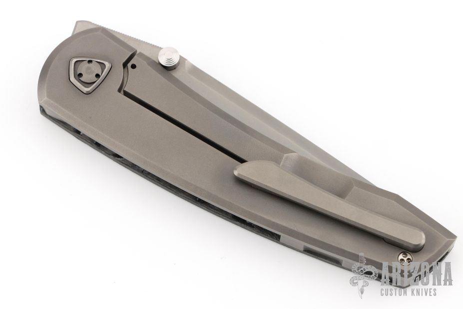 This Waka by Edison Barajas features a blasted blade with notched thumbrest and dual thumbstuds, can be front flipped. The handle has a chill vibes camocarbon and blasted titanium frame with matching backspacer and tip up clip. Has custom pivot. Rides on bearings, nice detent, lockup and blade seating. Comes with COA, dated 05-25. New from maker!