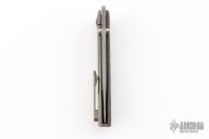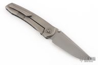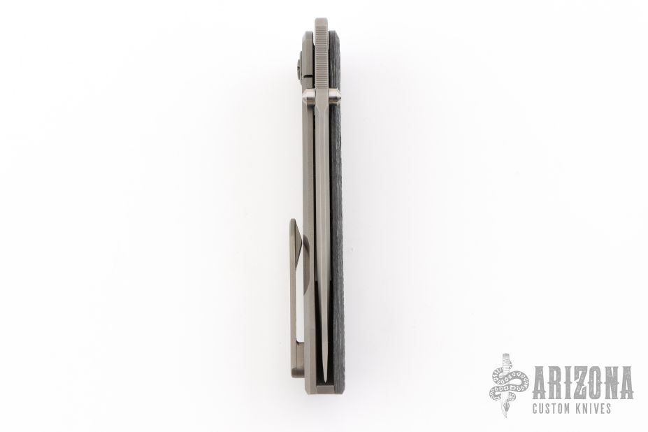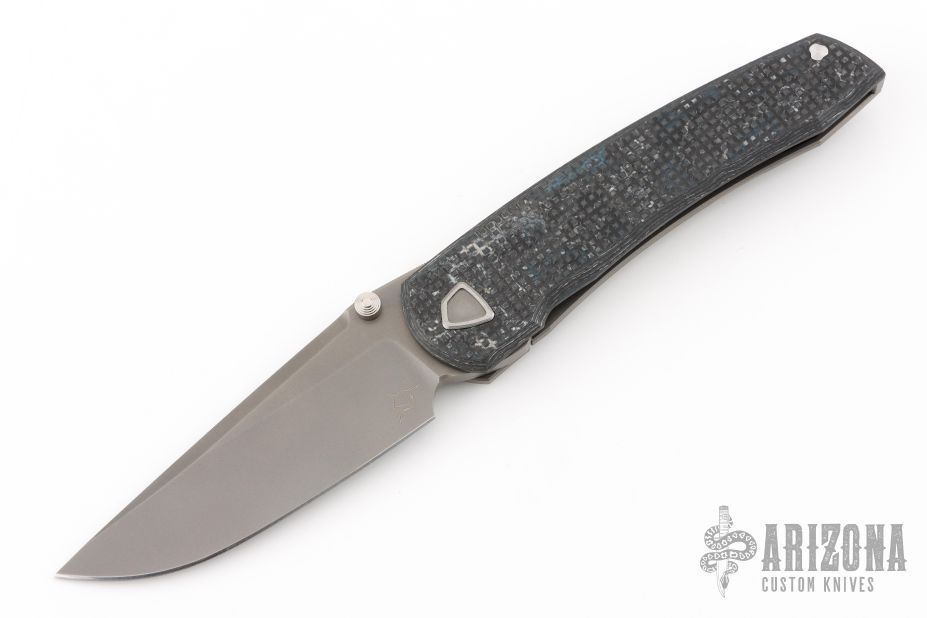 This Waka by Edison Barajas features a blasted blade with notched thumbrest and dual thumbstuds, can be front flipped. The handle has a chill vibes camocarbon and blasted titanium frame with matching backspacer and tip up clip. Has custom pivot. Rides on bearings, nice detent, lockup and blade seating. Comes with COA, dated 05-25. New from maker!