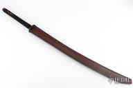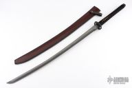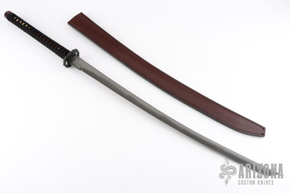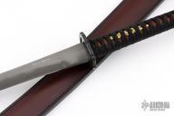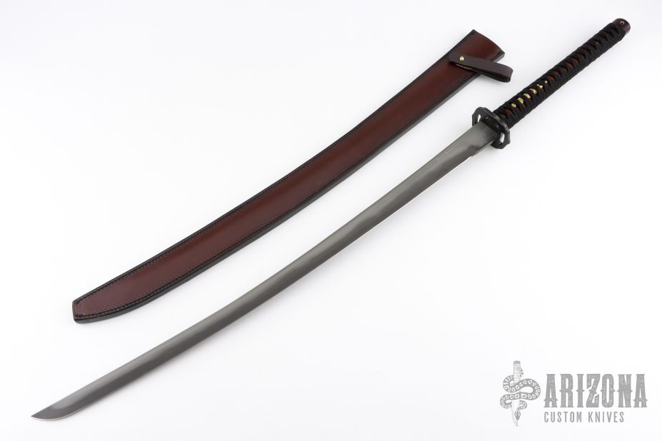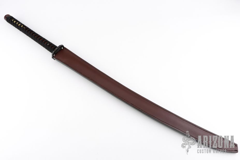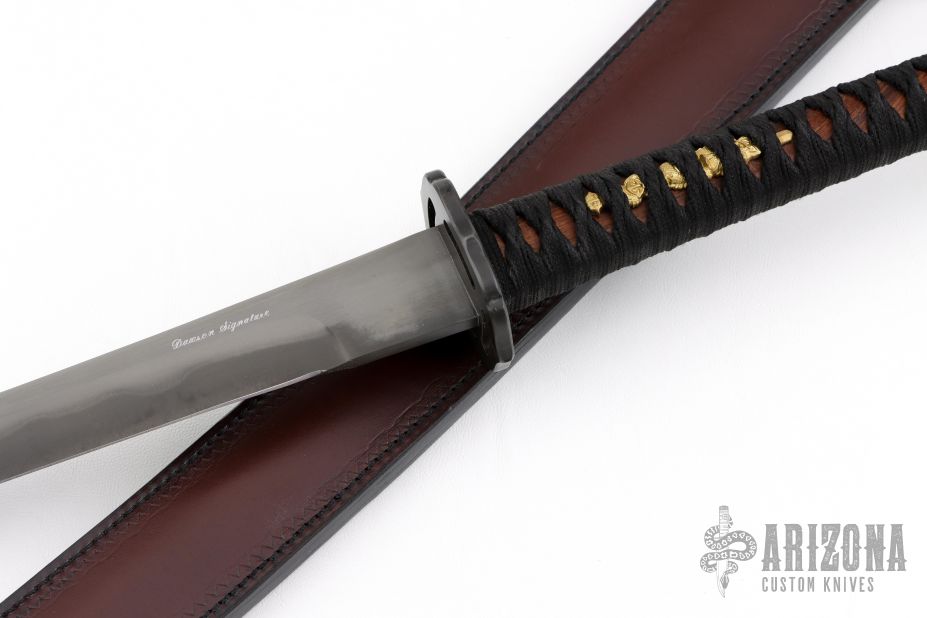 This Signature Katana from Barry Dawson features a blued blade with hamon, .268" blade stock and 1.434" blade depth, hidden tang construction. The handle has a black steel tsuba with black paracord Japanese style wrap over desert ironwood with mosaic pins and a brass dragon menuki. Comes with a brown leather sheath. Excellent condition.