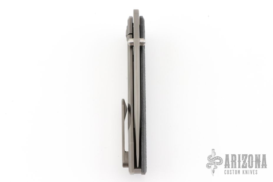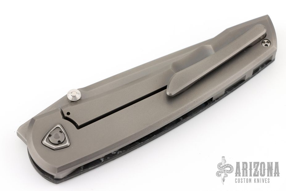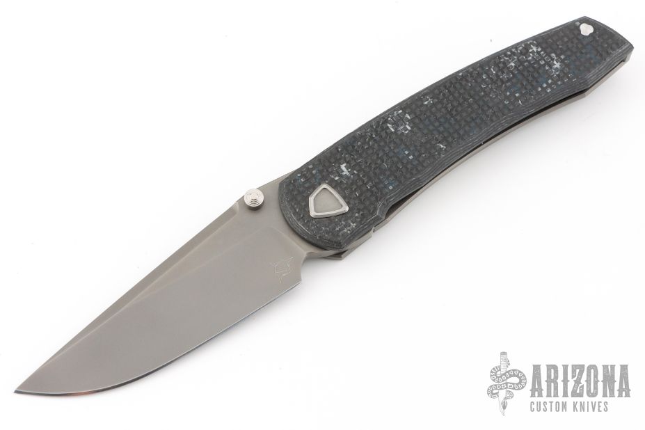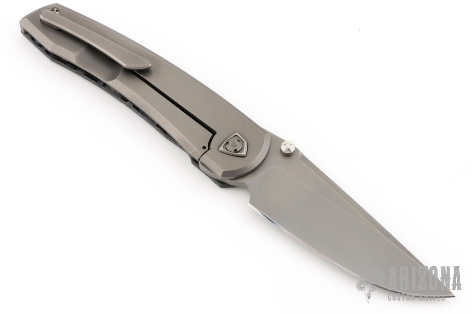 This Waka by Edison Barajas features a blasted blade with notched thumbrest and dual thumbstuds, can be front flipped. The handle has a chill vibes camocarbon and blasted titanium frame with matching backspacer and tip up clip. Has custom pivot. Rides on bearings, nice detent, lockup and blade seating. Comes with COA, dated 05-25. New from maker!